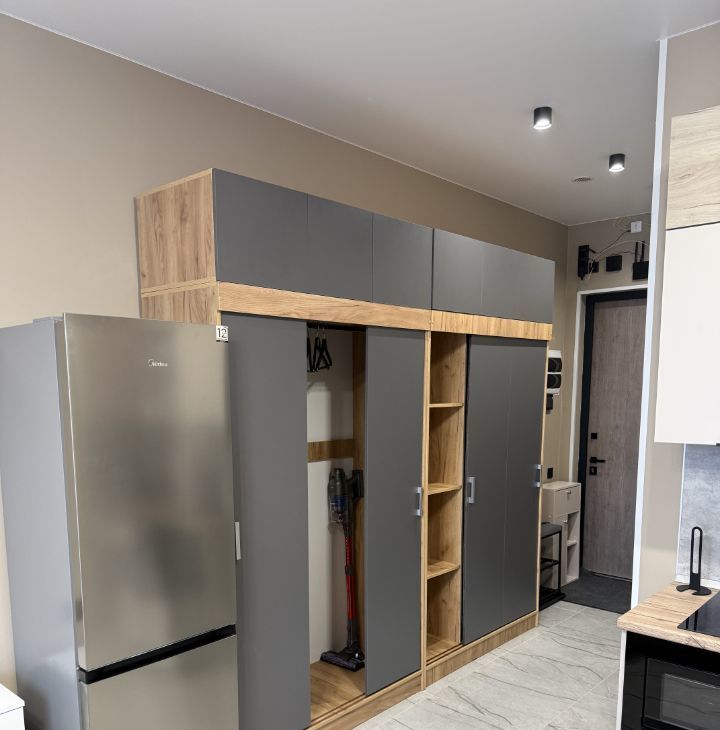 Новый кухонный гарнитур с холодильником, стиральной машиной и варочной панелью.