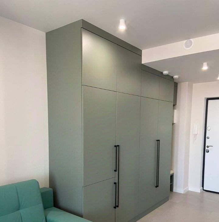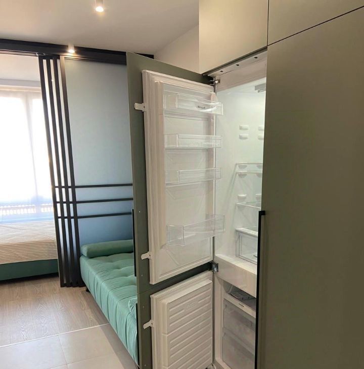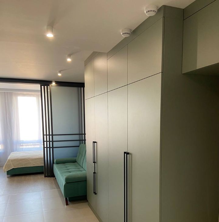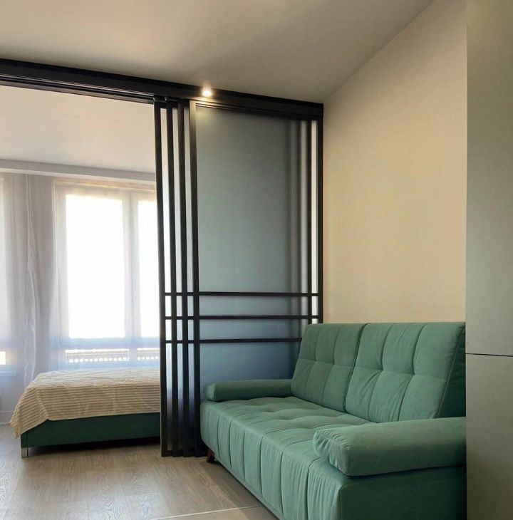 Установлена перегородка, которая позволяет полностью разделять спальню и кухню.