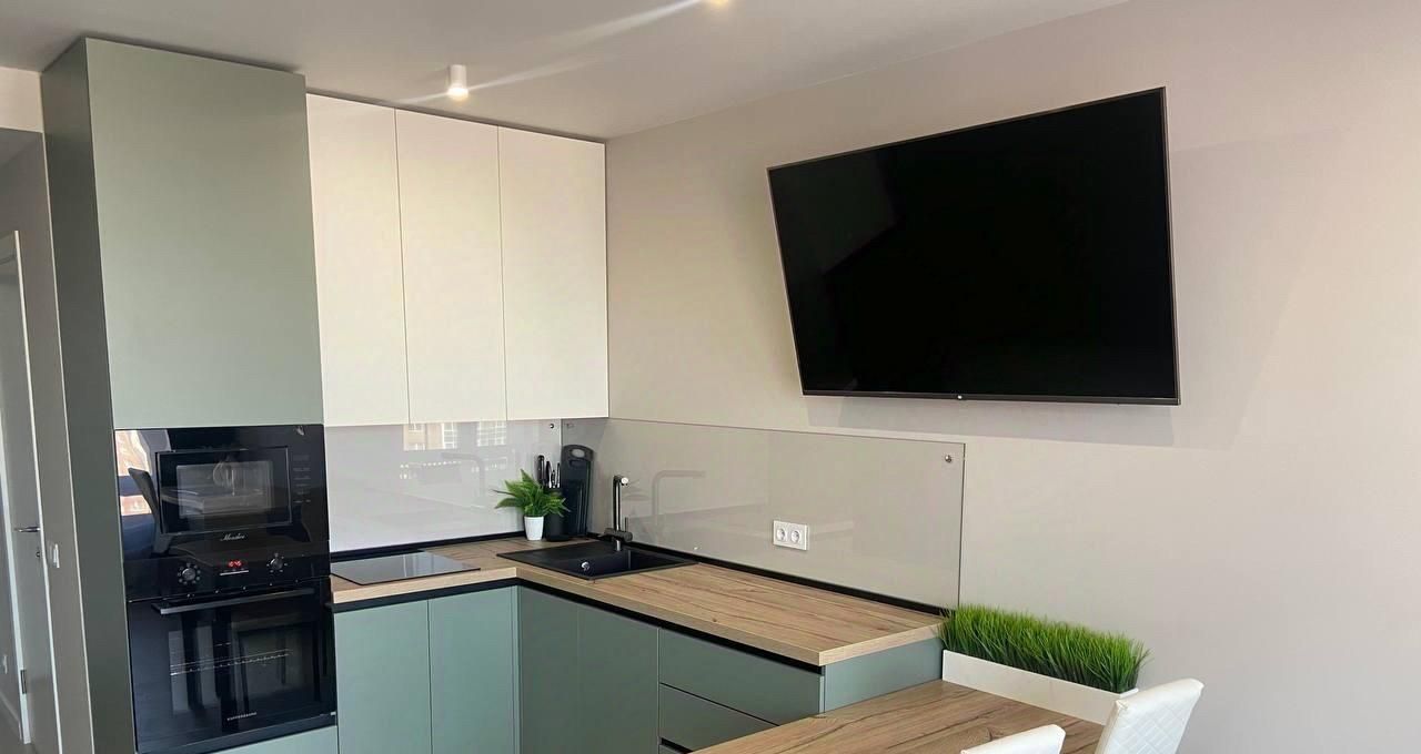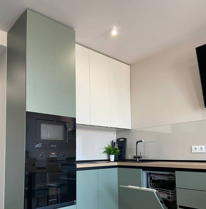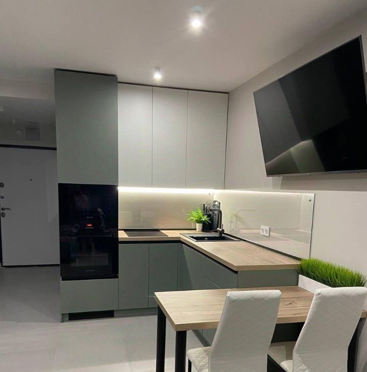 На кухне установлена вся необходимая техника: посудомойка, холодильник, варочная панель, духовой шкаф, встроенная микроволновка. Имеются: столовые приборы, кастрюли, чайник, посуда, ножи, доски, подставки и т.д. что позволит сразу жить и не беспокоиться о мелочах. На кухонном гарнитуре установлена подсветка.