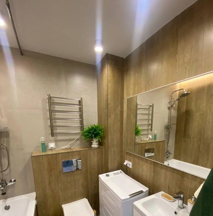 Дизайнерский санузел с ванной и душем, а также установлена новая стиральная машина и полотенцесушитель.