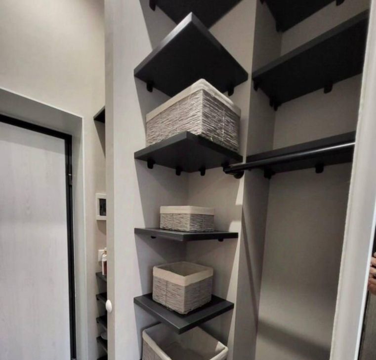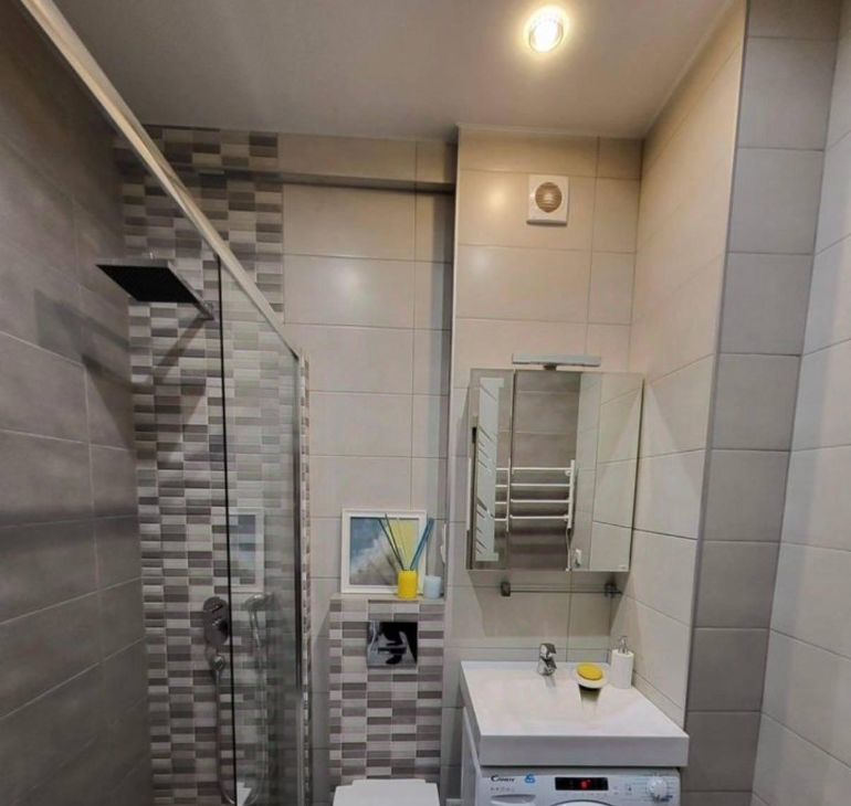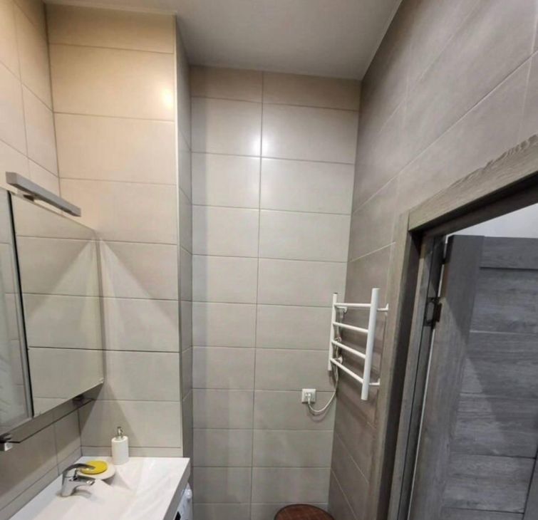 Душевая с тропическим душем, полка Икеа, полотенцесушитель. На окнах жалюзи блэкаут.