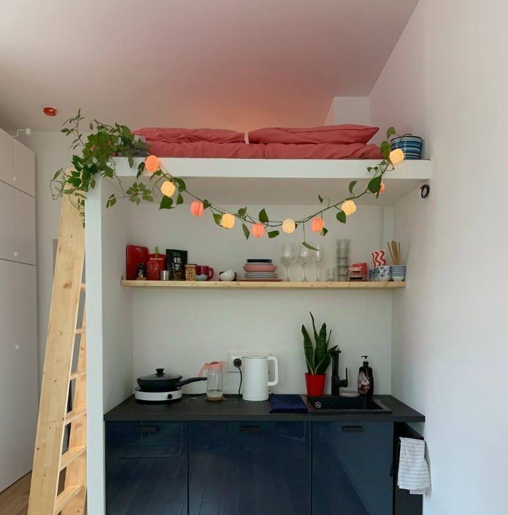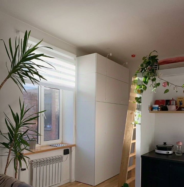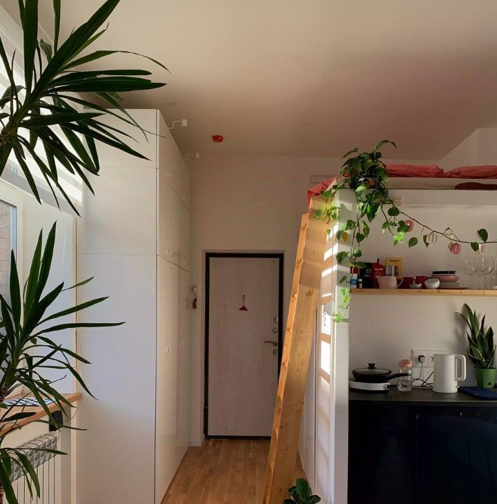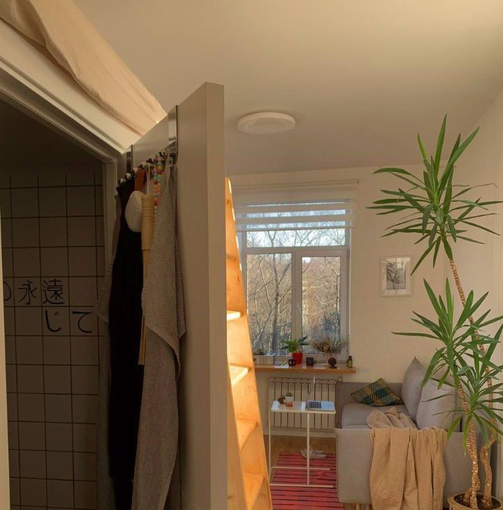 Потолки 3,2 м. Сделан второй уровень — полноценная спальная зона, при этом основное пространство остаётся свободным.