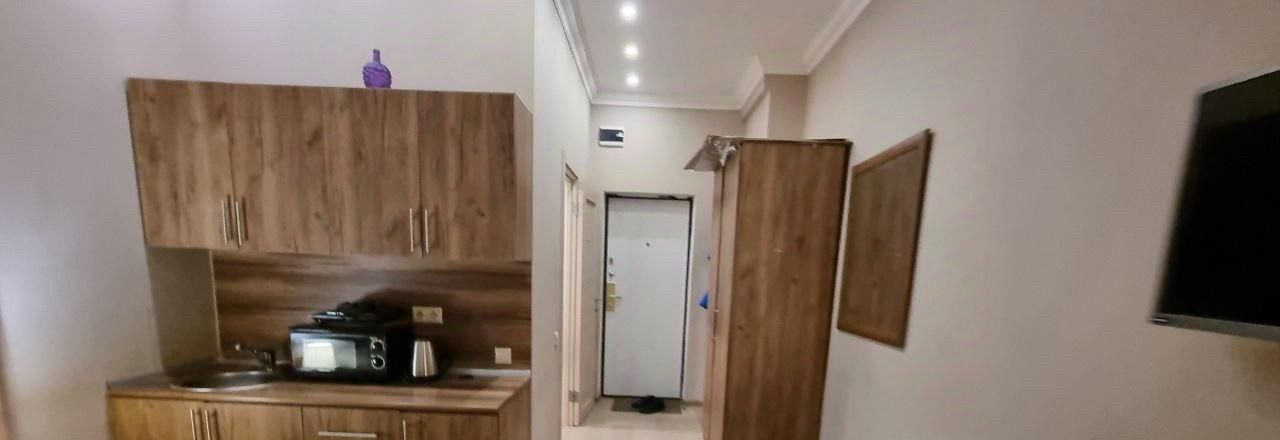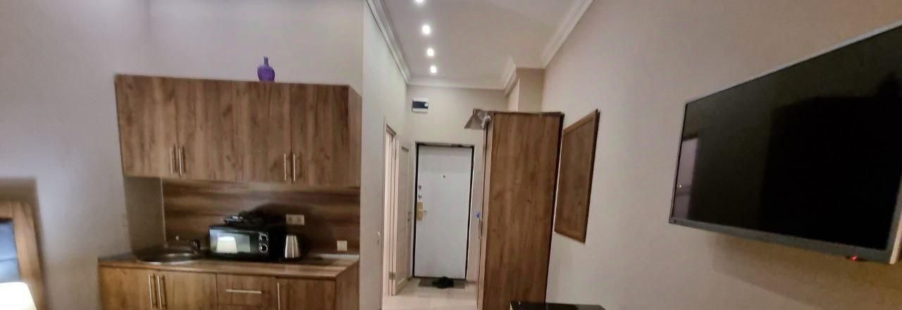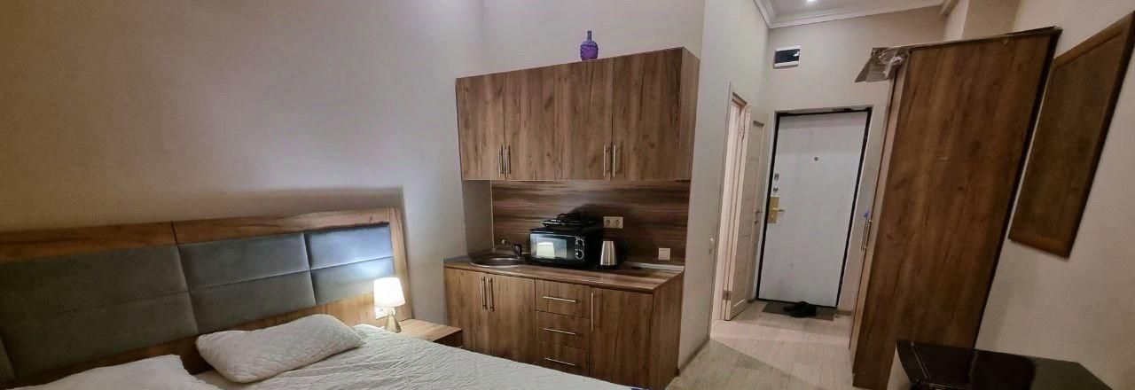 В студии выполнен современный евроремонт. Вся необходимая мебель и техника включены: кондиционер, холодильник, телевизор и стиральная машина. Просторная комната с мебелью и обустроенная кухня создают атмосферу комфорта и уюта. Санузел совмещённый, оборудован душевой кабиной. Окна выходят на улицу, что делает помещение светлым и просторным.