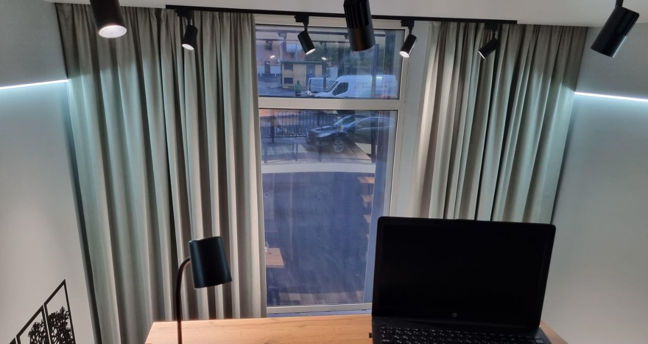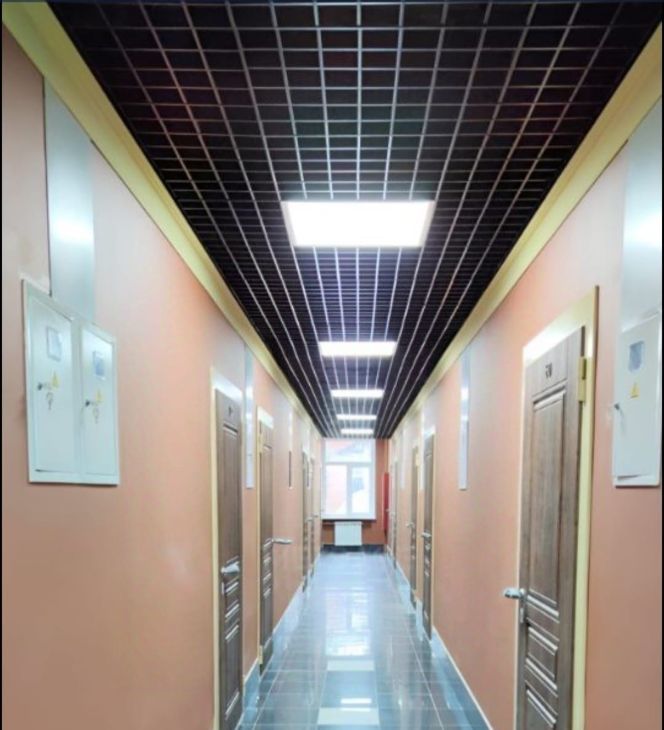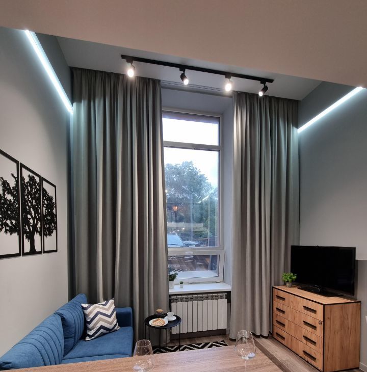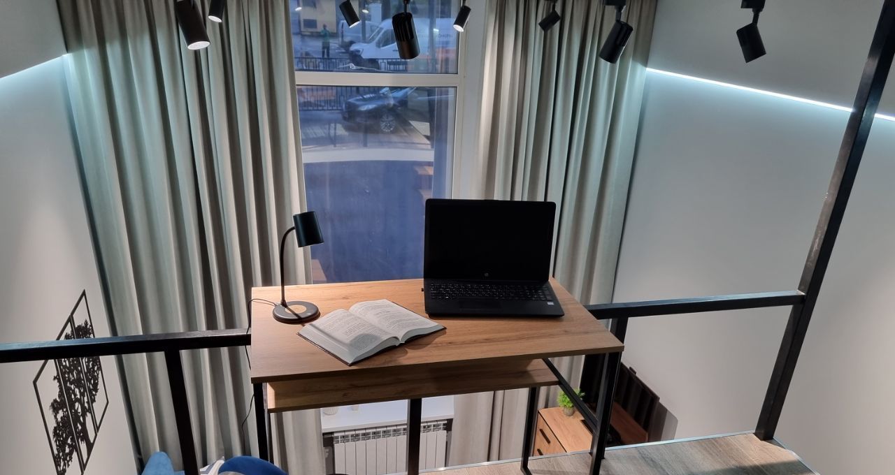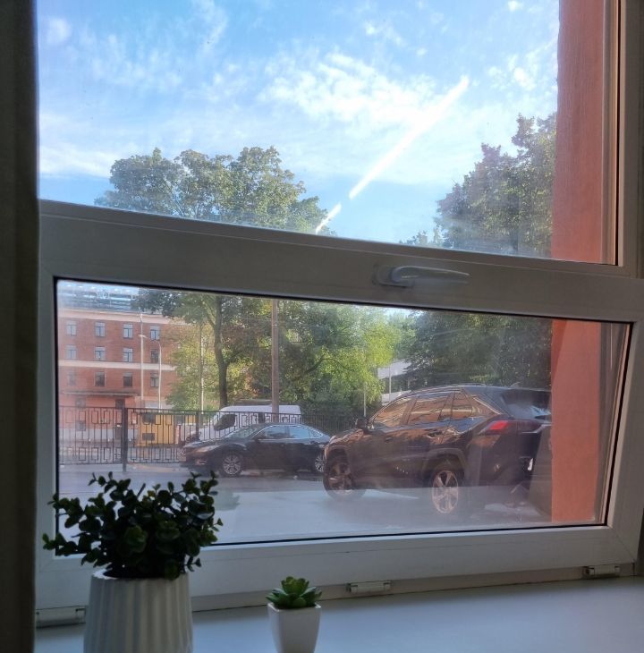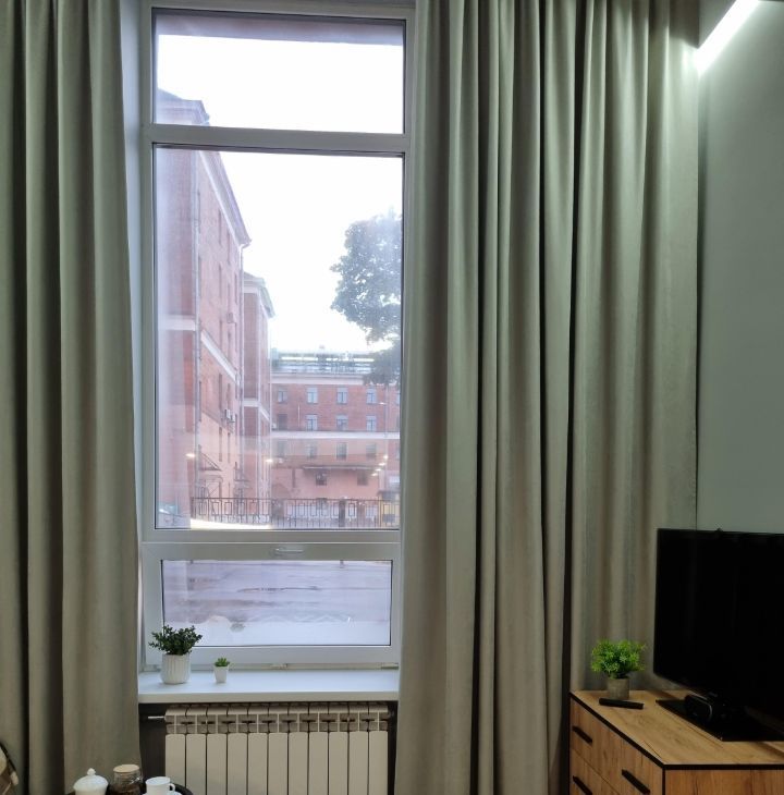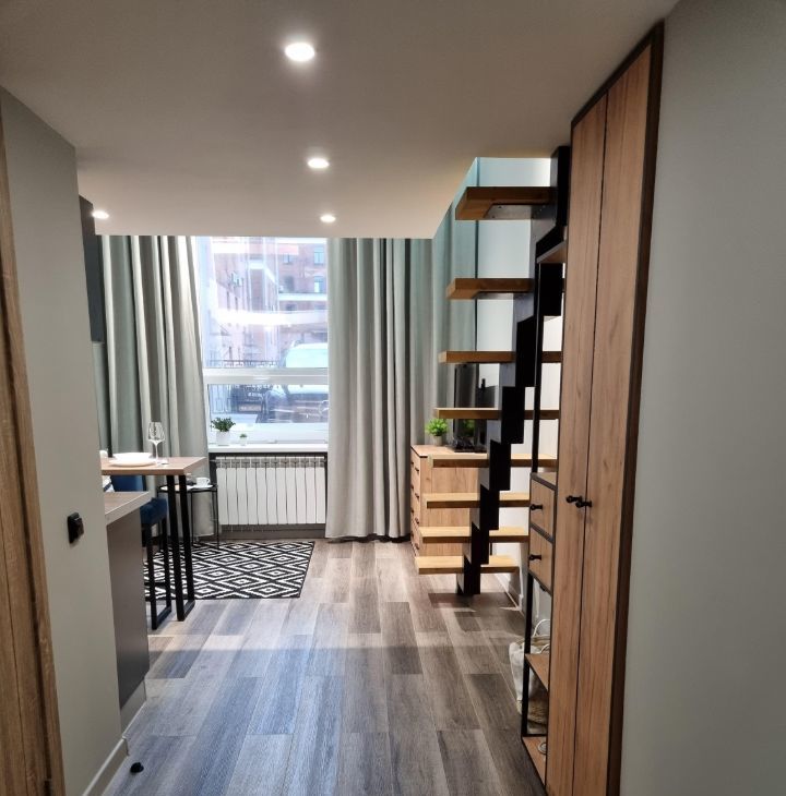 Площадь 32 м2 с высотой потолков 3.8 метра и большим высоким окном с зеркальной тонировкой для ценителей больших и светлых пространств.