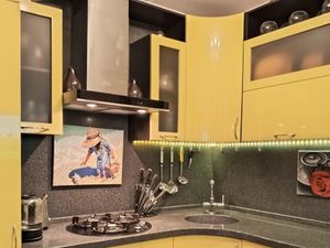 В квартире новый качественный и современный ремонт, есть вся необходимая мебель и техника: кондиционер, холодильник, телевизор микроволновая печь, чайник и стиральная машина. Ванная комната с душевой кабиной. Окна выходят на улицу, в помещении светло.