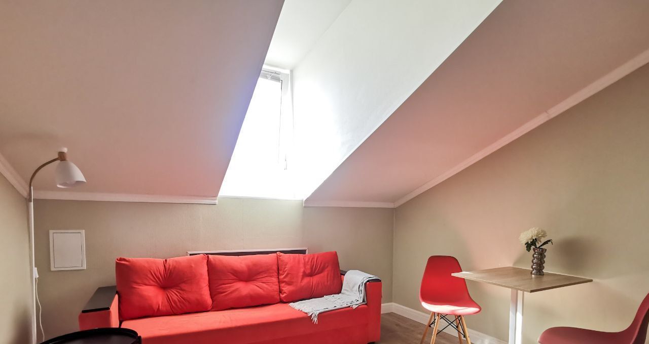 Квартира имеет удобную функциональную планировку и мансардное окно, благодаря чему пространство наполнено естественным светом и создаёт ощущение уюта и приватности.