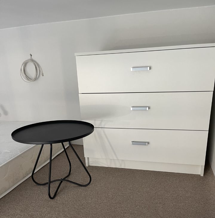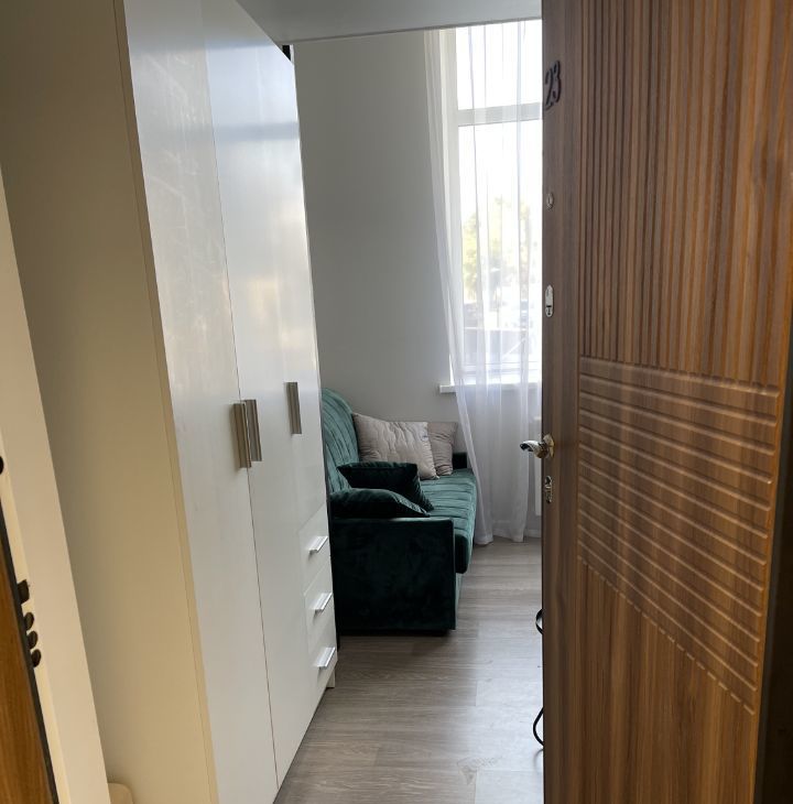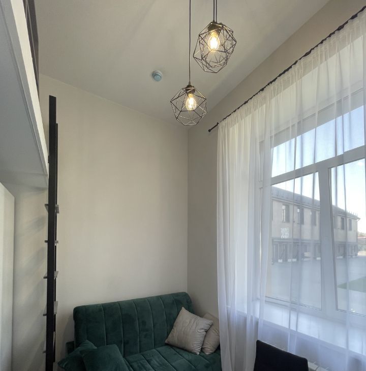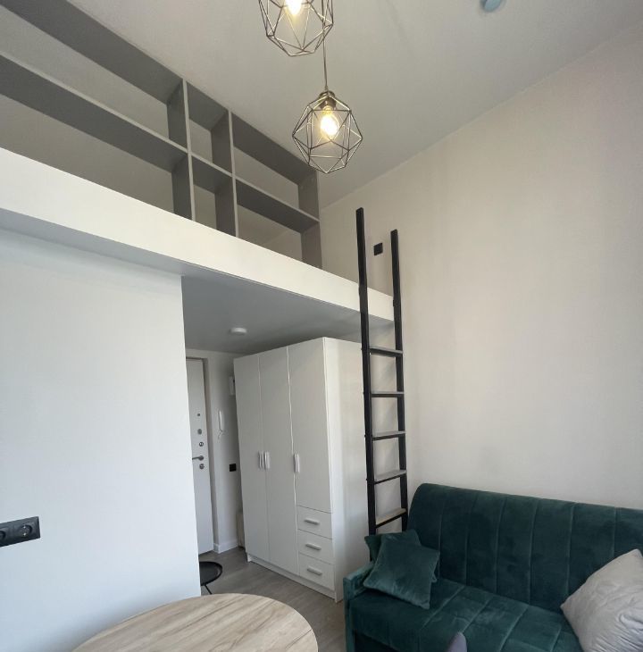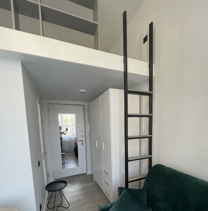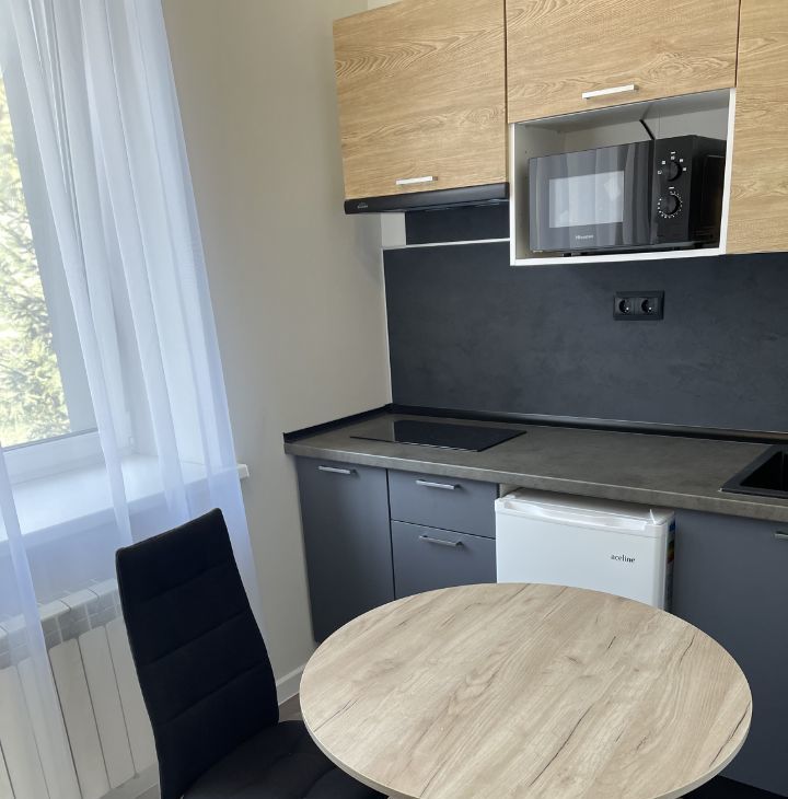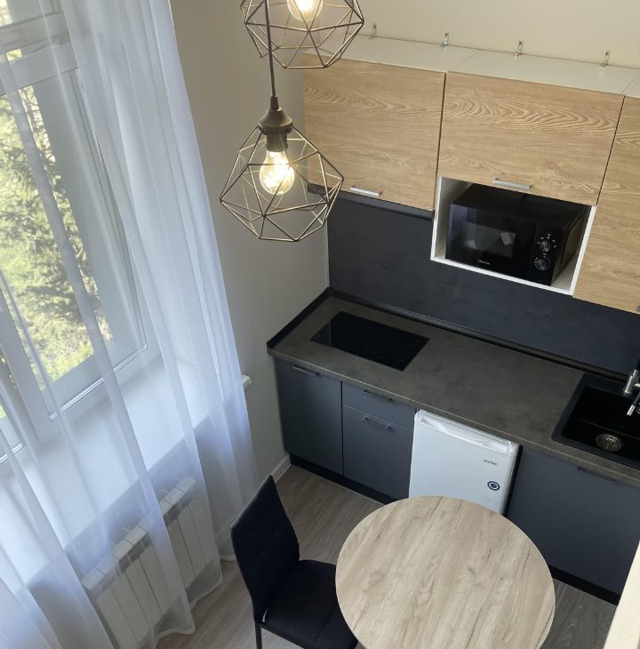 В студии есть всё необходимое для комфортного проживания — мебель на кухне и в комнате, а также техника: холодильник и стиральная машина.