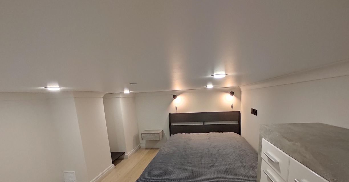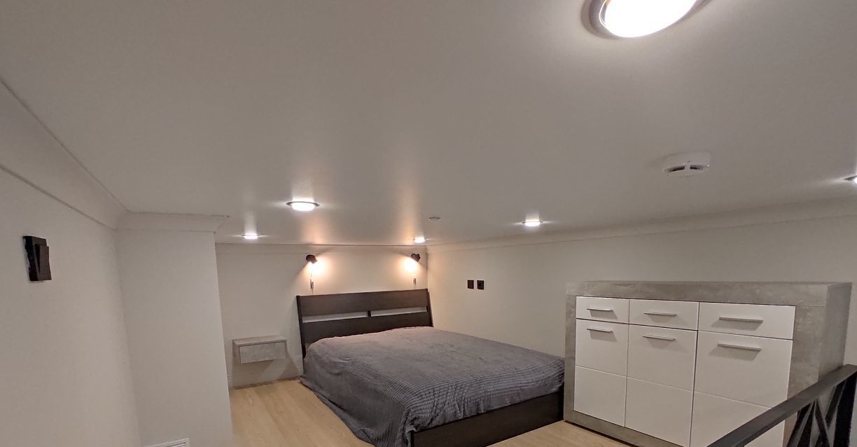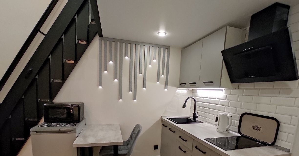 На 1-м уровне студии располагается прихожая, совмещённый санузел, кухня с большим количеством зон хранения и гостевая зона с раскладным диваном и ТВ. На 2-м уровне находится спальная зона: двуспальная кровать с ортопедическим матрасом, большой шкаф-комод для хранения одежды.