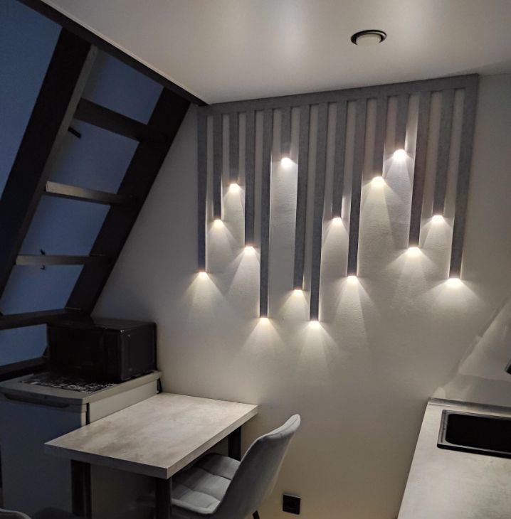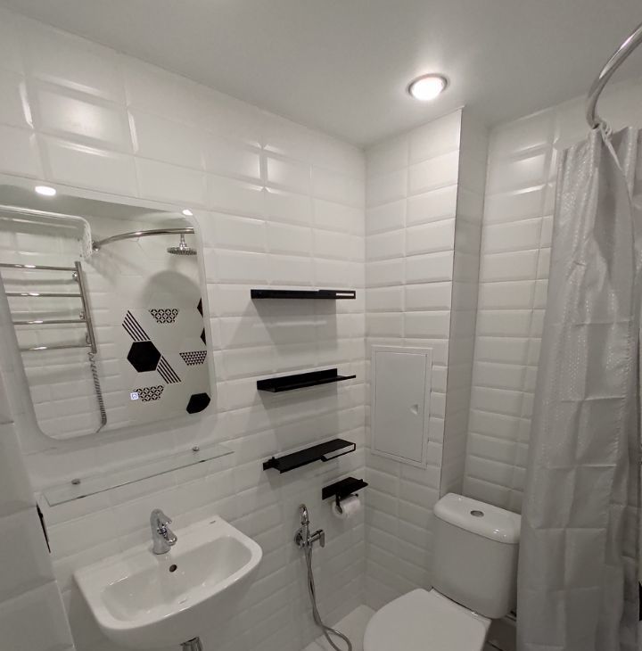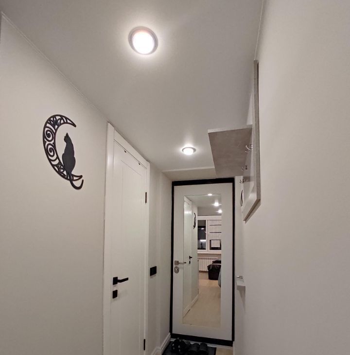 Предусмотрена раздельная регулировка освещения: свет в прихожей, вечерний свет на кухне, торшер, бра у кровати и общий свет. Удобный вариант, когда нужно заниматься своими делами и не мешать друг другу.