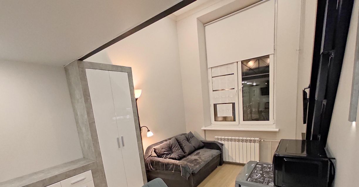 Оборудована техникой: стиральная машина, холодильник, смарт-тв, электроплита, микроволновка, чайник. Высокие потолки, панорамное окно с хорошим видом и рулонной шторой блэк-аут (она же, как экран для проектора).