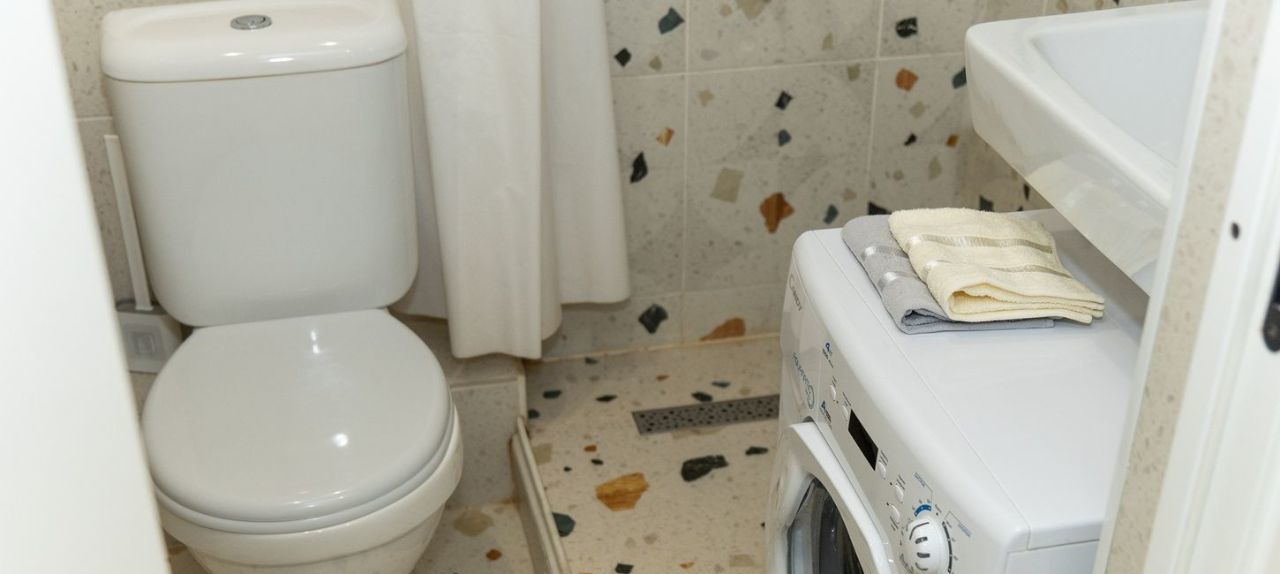 - Туалетная комната с душем, раковиной, унитазом и стиральной машиной.