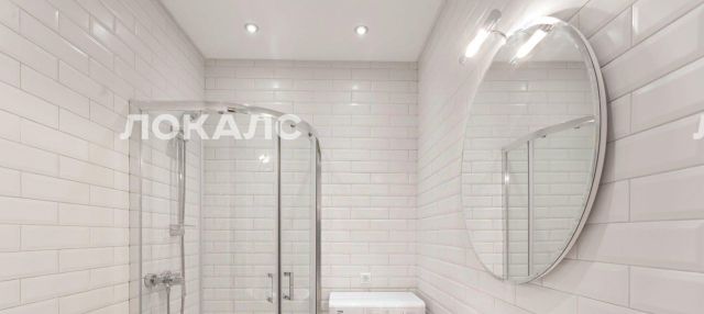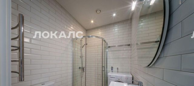 В квартире один совмещенный санузел с душевой кабиной, раковиной, зеркалом с подсветкой и стиральной машиной.