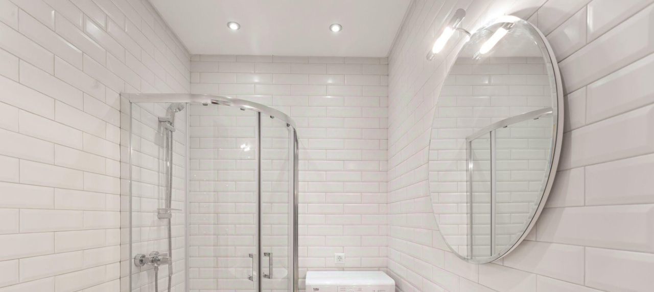 В квартире один совмещенный санузел с душевой кабиной, раковиной, зеркалом с подсветкой и стиральной машиной.