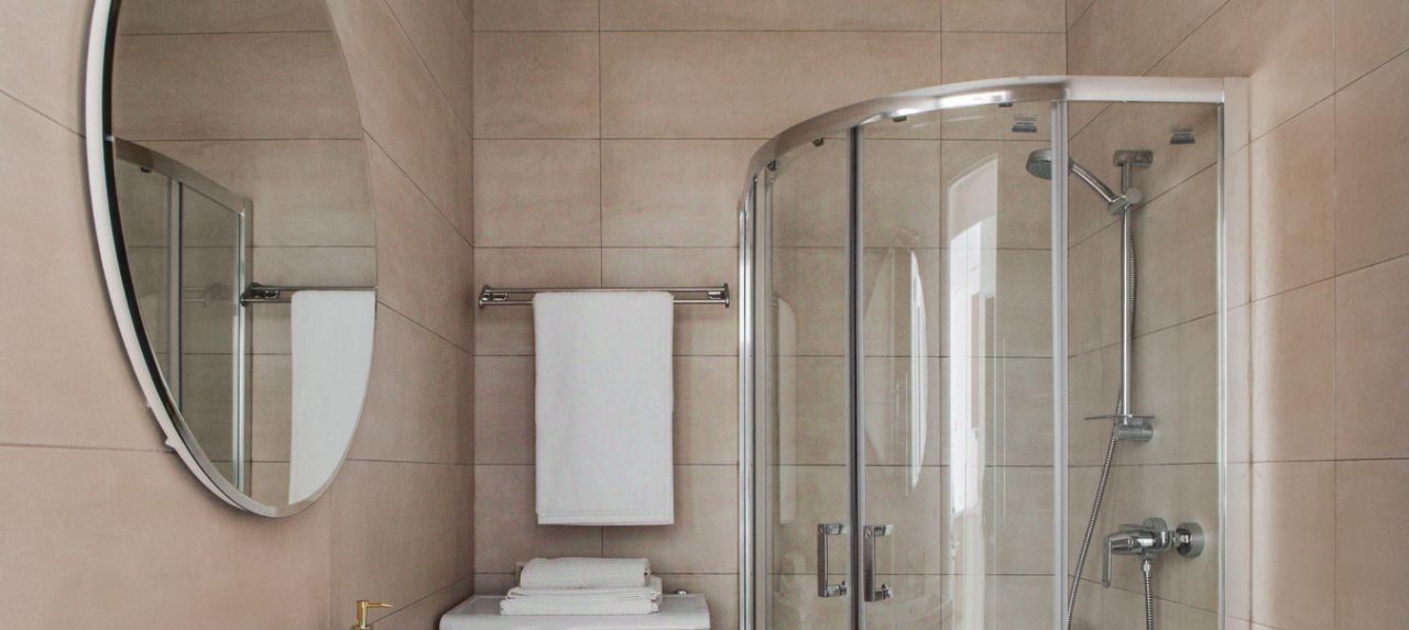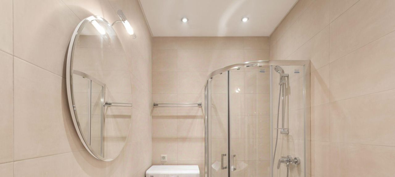 В квартире один совмещенный санузел с душевой кабиной, раковиной, зеркалом с подсветкой и стиральной машиной.