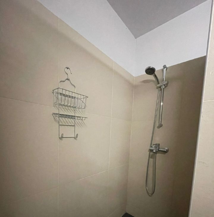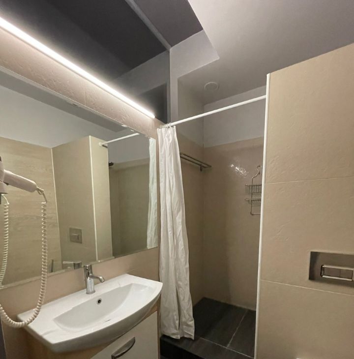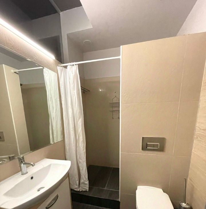 Апартаменты на втором этаже, 32 квадратных метра. Очень хороший совмещённый санузел с душевой кабиной.