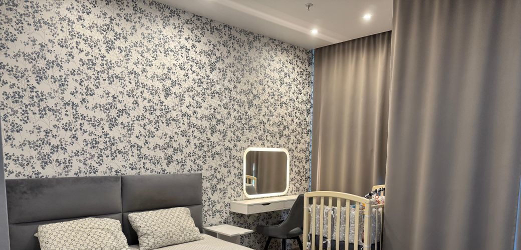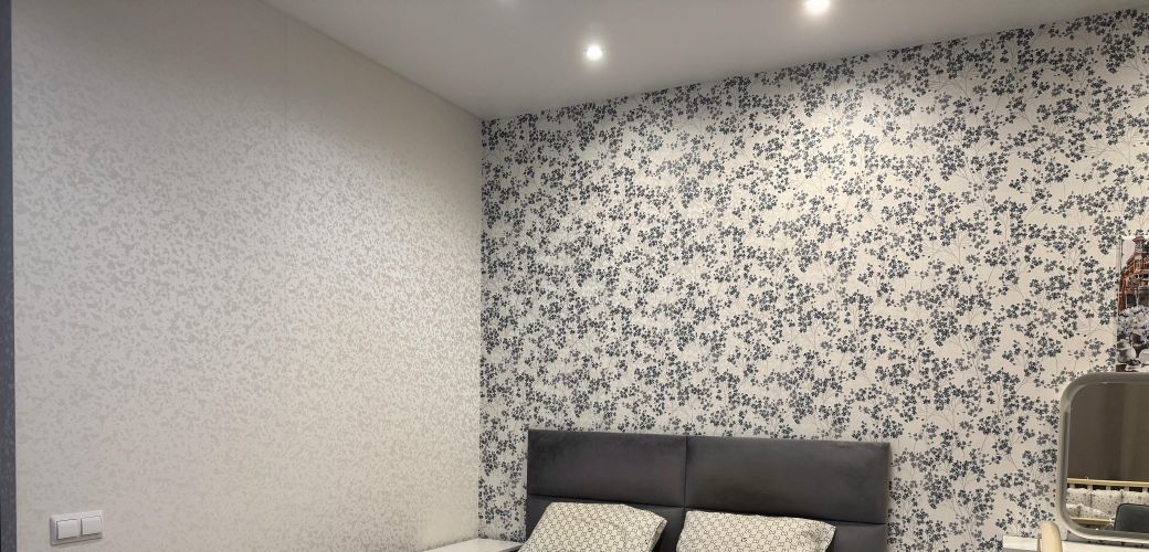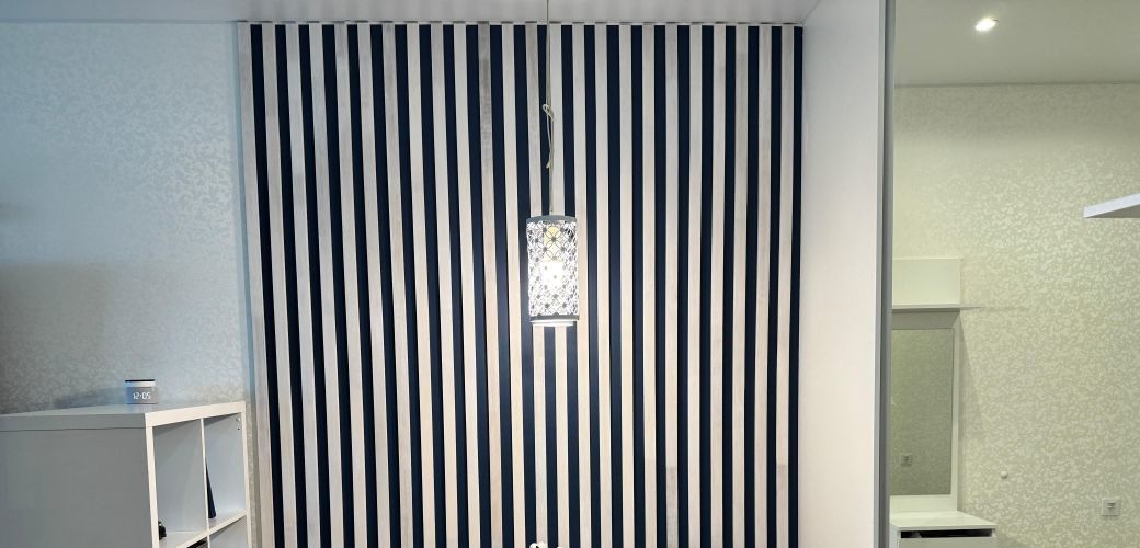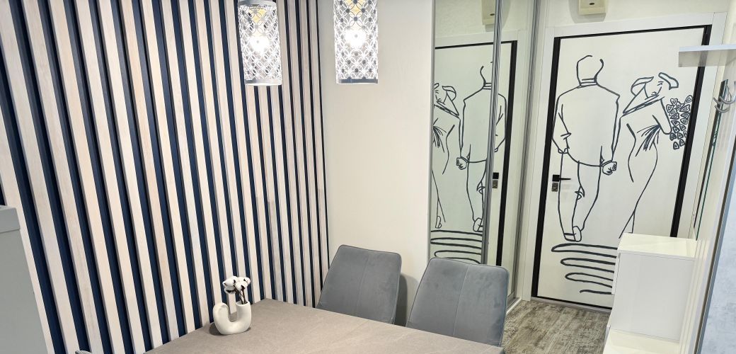 Отделка: обои в спальне и коридоре, венецианская штукатурка на кухне, декоративные рейки в обеденной зоне.