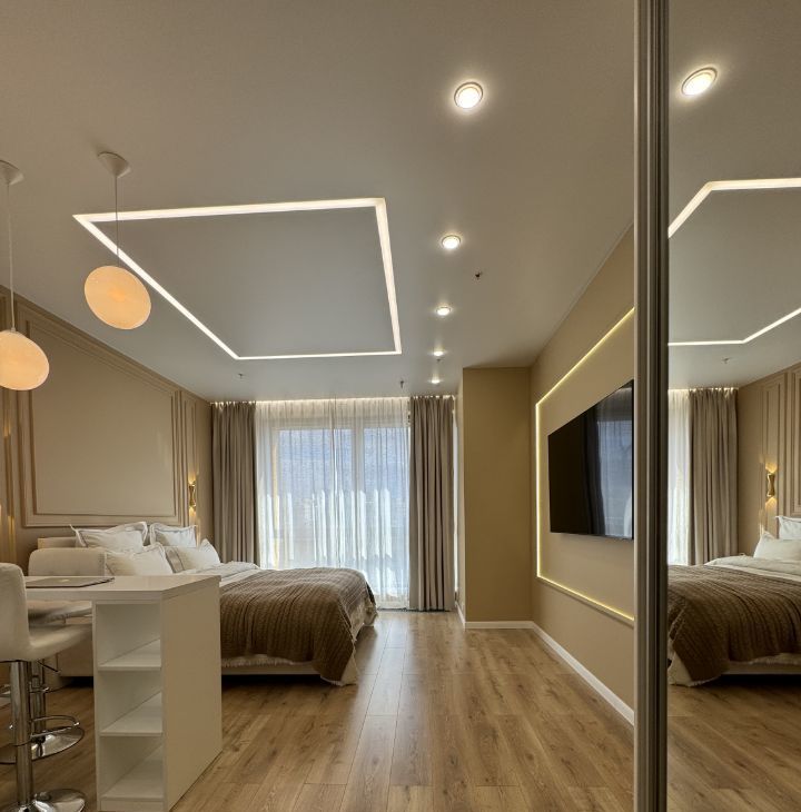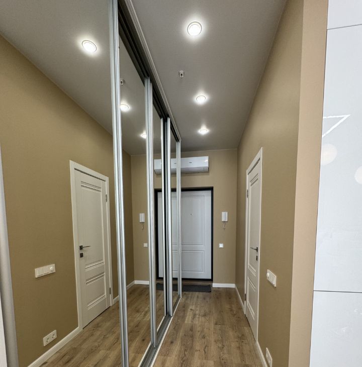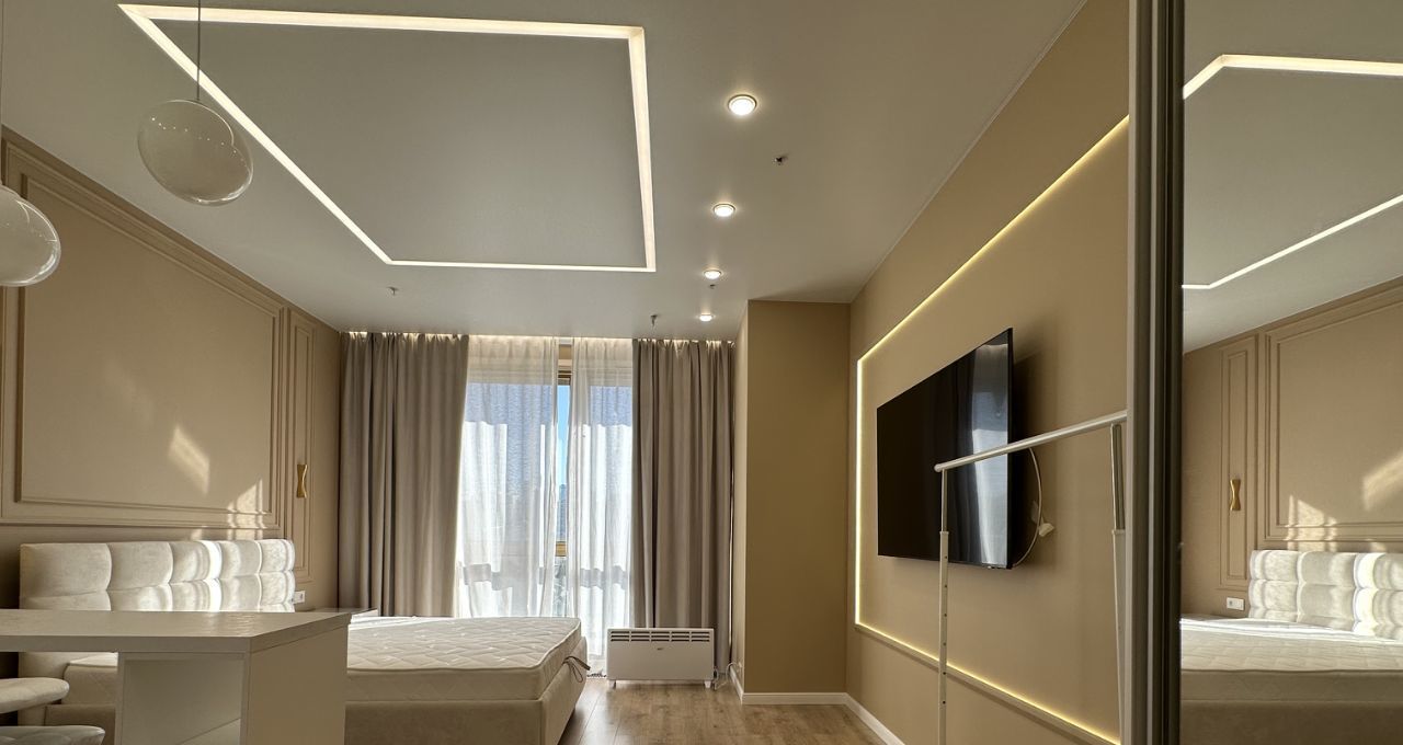 Апартамент оборудован всей необходимой мебелью, нет проблем с хранением большого количества вещей (вместительный 4-х секционный шкаф, вместительная зона под кроватью с подземным механизмом ( для хранения сезонной одежды и обуви), кондиционер, холодильник, варочная панель, микроволновая печь, посудомоечная и стиральная машина, смесители и инсталляция от GROHE, гигиенический душ. Многоуровневое освещение - зонирование : 8 вариантов подсветки для любого настроения и создания уюта. Шторы black out. Панорамные окна в пол. Отделка выполнена в светлых тонах, что позволяет придать индивидуальности вашему новому дому, добавив цветовые акценты с помощью любимых предметов интерьера и аксессуаров. Установлена огромная плазма с подсветкой. Встроенная гардеробная с зеркалами в пол для красивых селфи, эргономичная кухня со всем необходимым для комфортного проживания, барная стойка, позволяет работать или трапезничать с прекрасными видами. Ванная комната оснащена угловой ванной, что позволяет