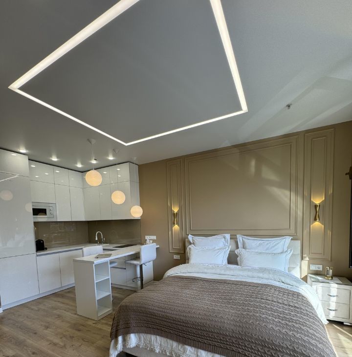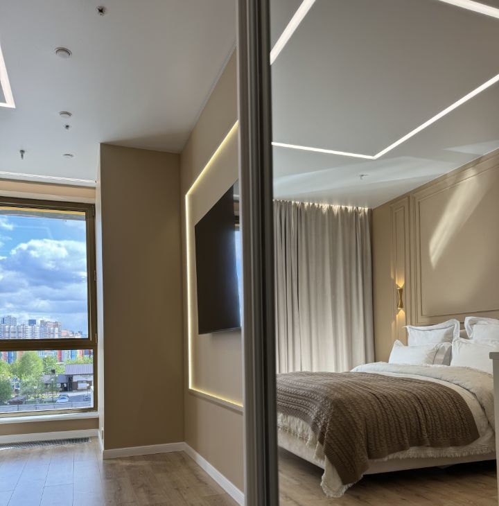 Элегантная светлая студия, все АБСОЛЮТНО НОВОЕ, недавно завершен ремонт, еще никто не проживал, сдается впервые, площадь 35 м², расположена на 2-м этаже в ЖК Лайнер с великолепным видом на церковь и Москва-сити, подъезд ближайший к метро всего в 2-х минутах от м.ЦСКА, рассчитана на одного гостя и оснащена одной двуспальной кроватью размера king-size от ORMATEK с ортопедическим матрасом.