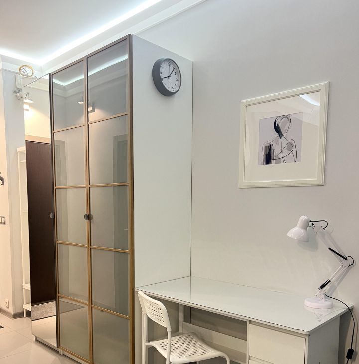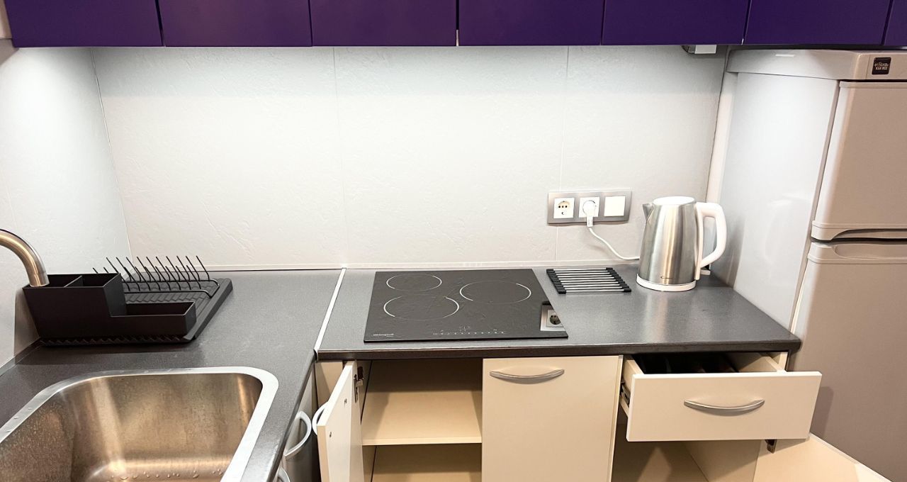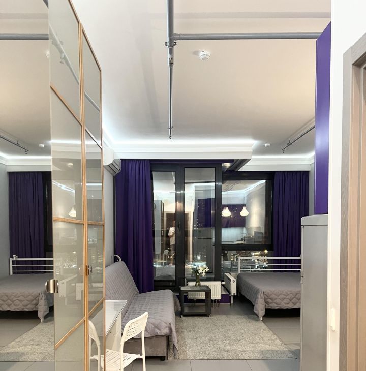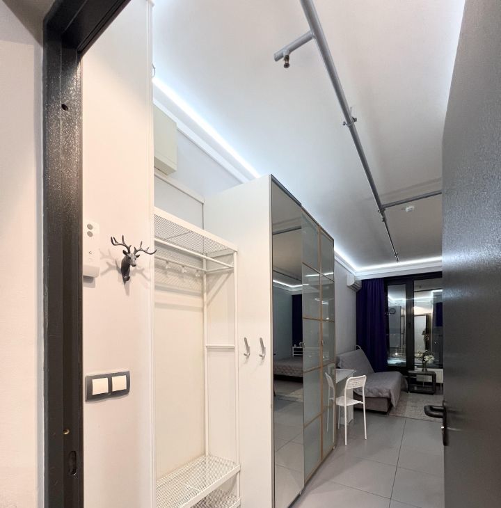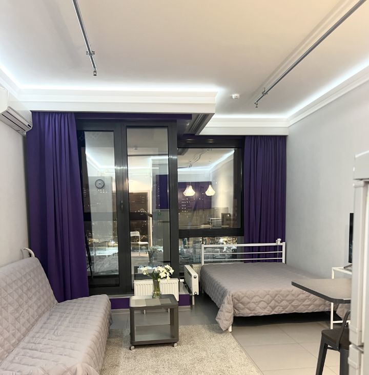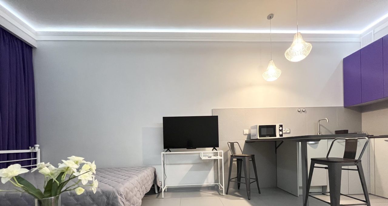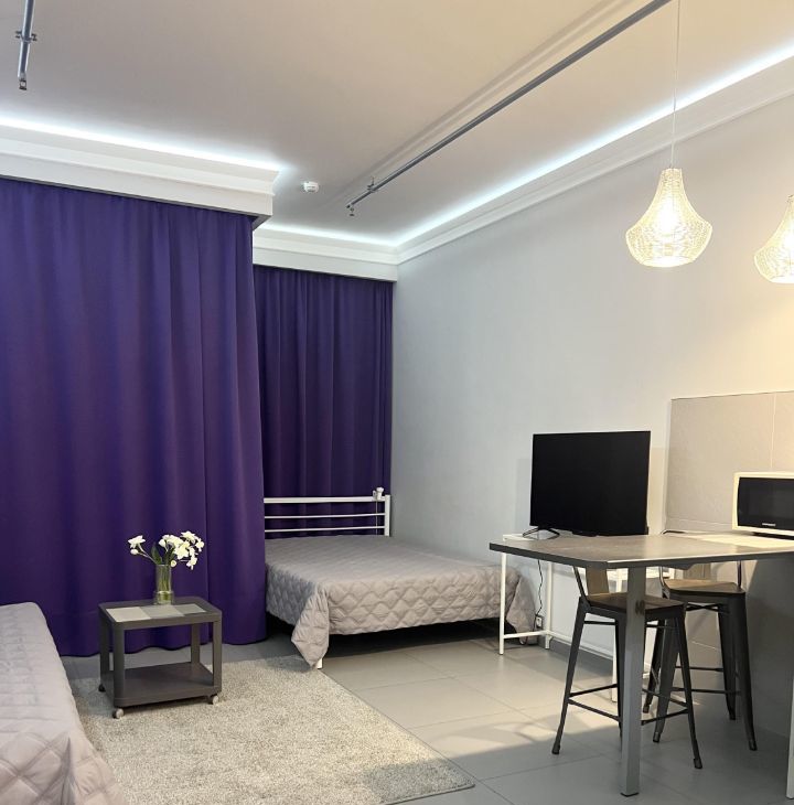 Студия оборудована всем необходимым для комфортного проживания - кондиционер (обогрев и охлаждение)/ холодильник/ варочная электрическая плита 3 конфорки/ микроволновая печь/ посудомоечная машина/ стиральная машина/ холодильник/ электрический чайник/ кровать 200х140/ раскладной диван со спальным местом 200х140см/ рабочий стол/ телевизор 43* с Алисой/ 2 настенные сушилки для белья/ утюг и гладильная доска/ пылесос/ много мест хранения.