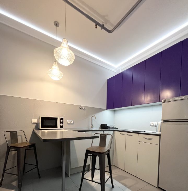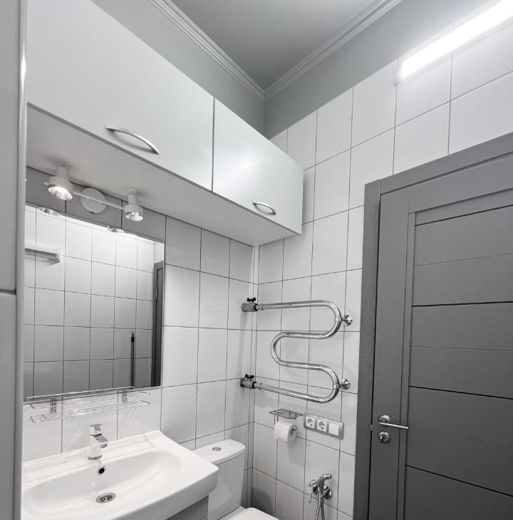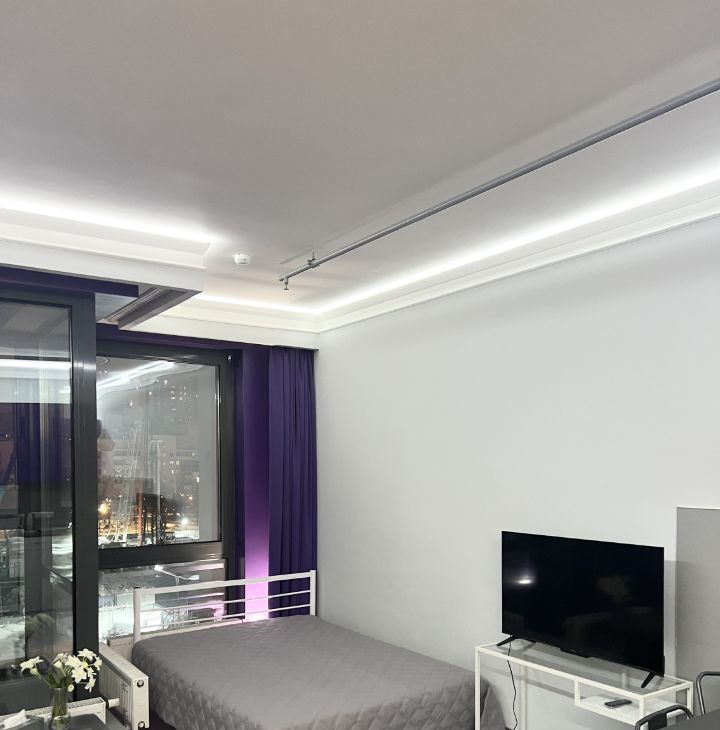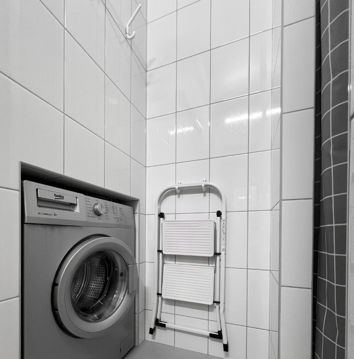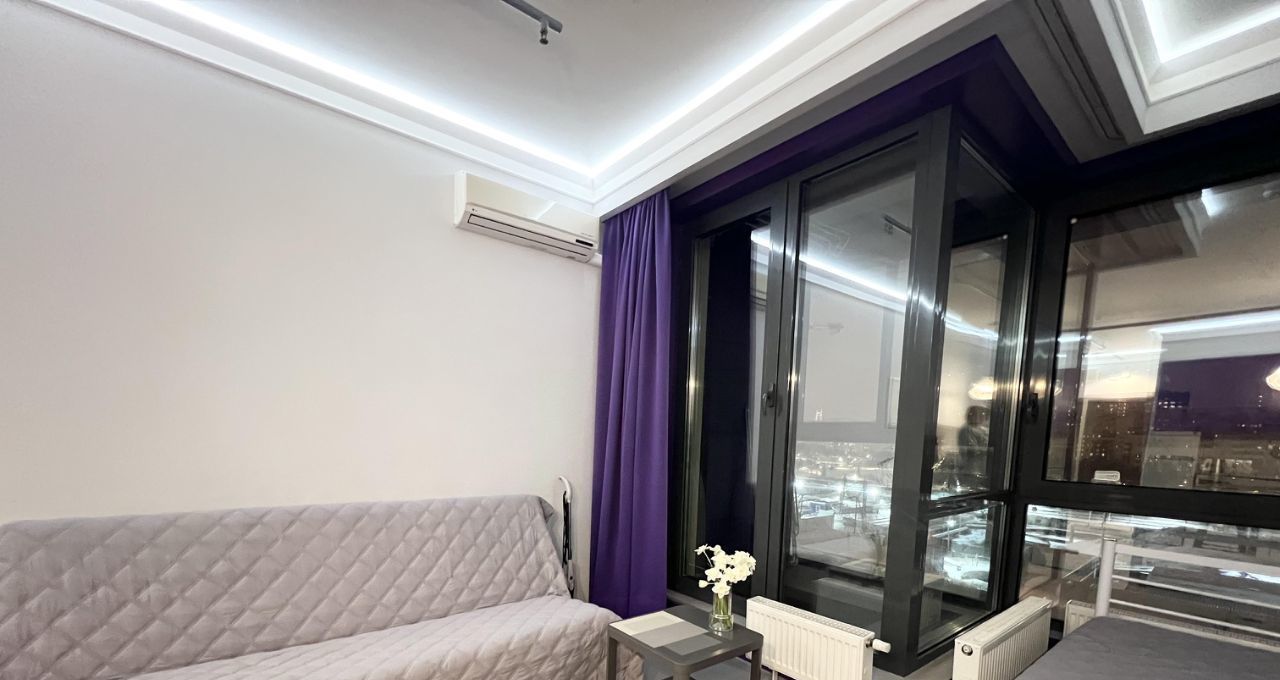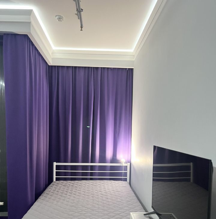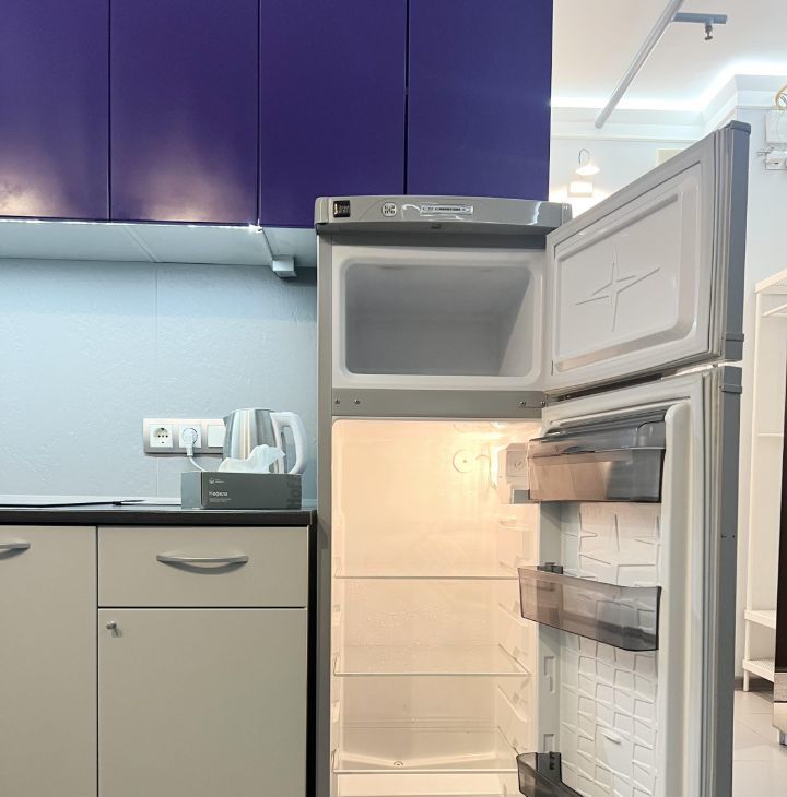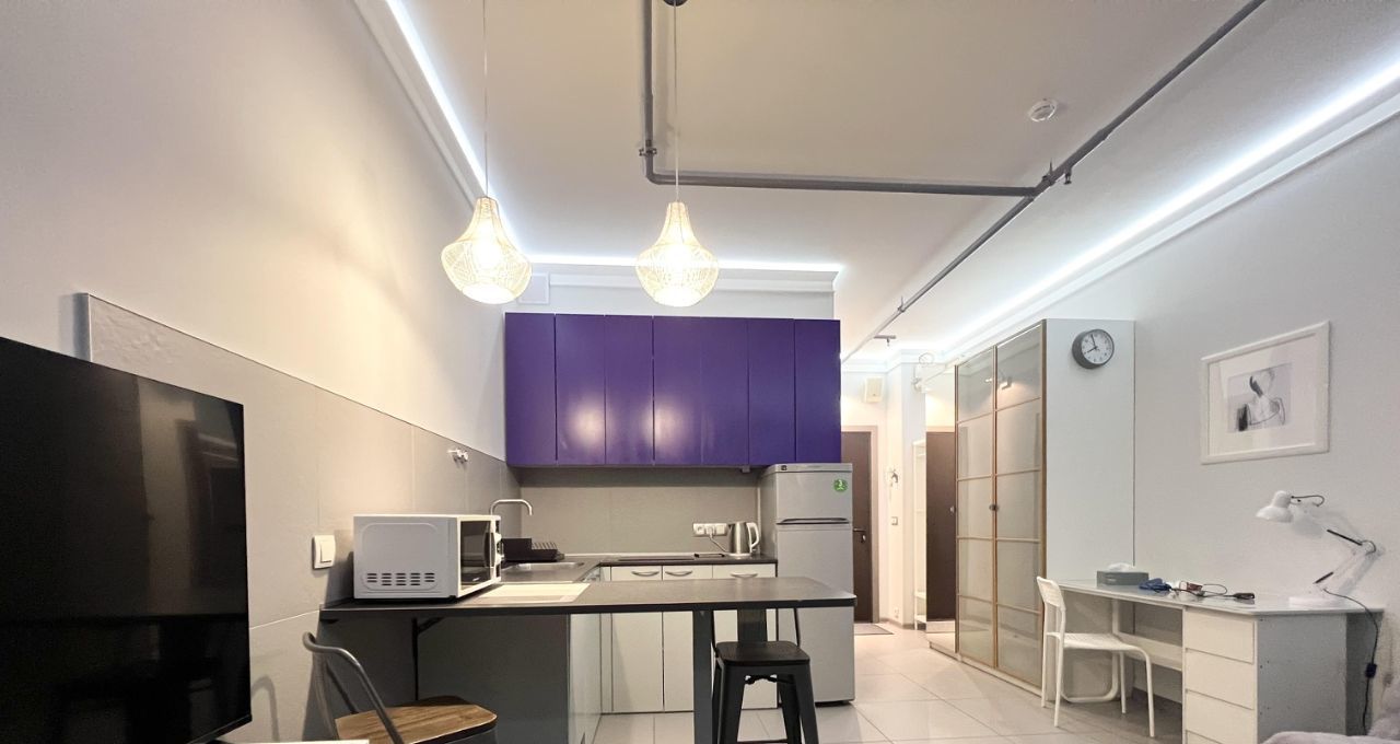 Студия оборудована всем необходимым для комфортного проживания - кондиционер (обогрев и охлаждение)/ холодильник/ варочная электрическая плита 3 конфорки/ микроволновая печь/ посудомоечная машина/ стиральная машина/ холодильник/ электрический чайник/ кровать 200х140/ раскладной диван со спальным местом 200х140см/ рабочий стол/ телевизор 43* с Алисой/ 2 настенные сушилки для белья/ утюг и гладильная доска/ пылесос/ много мест хранения.