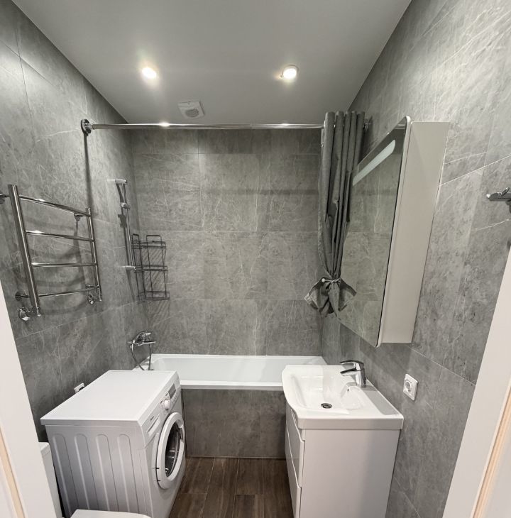 Совмещённый санузел с комфортной ванной, раковиной и зеркалом