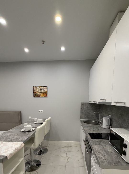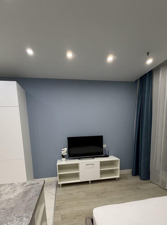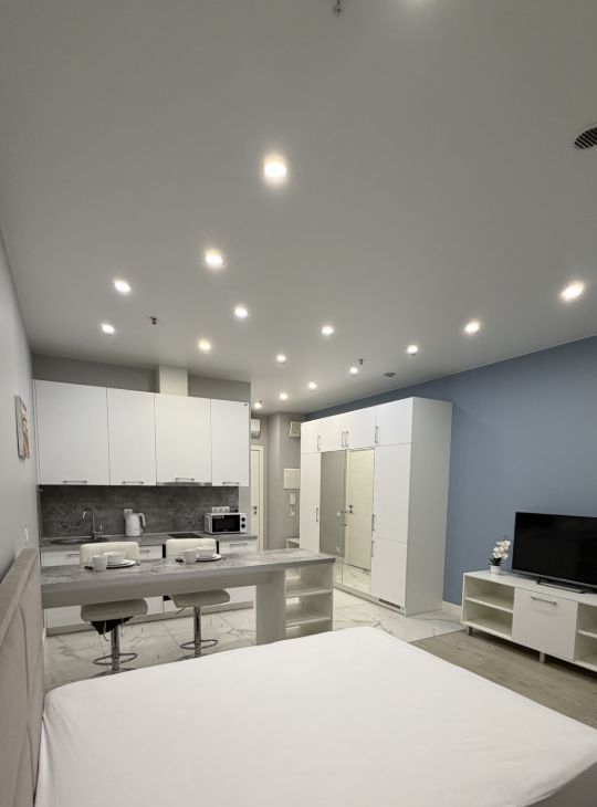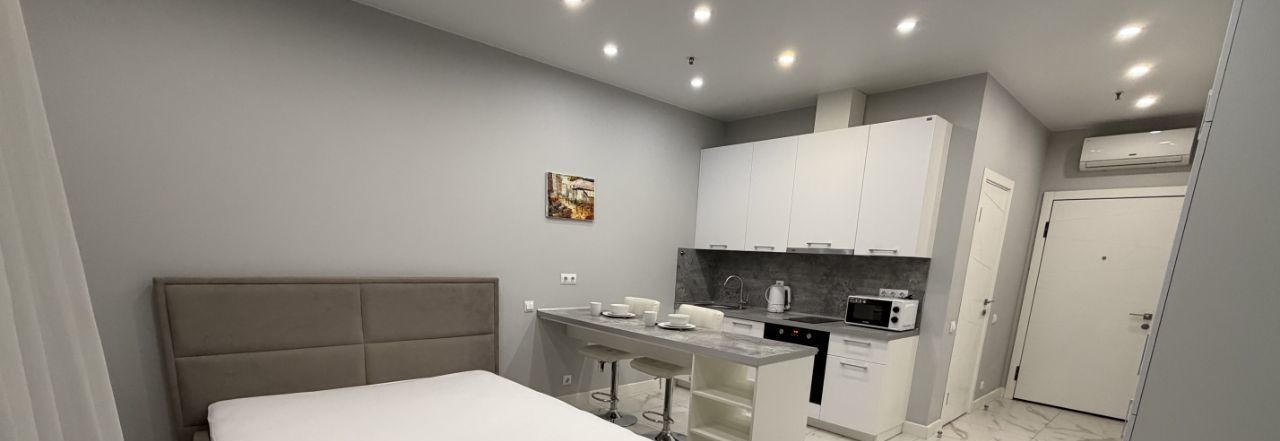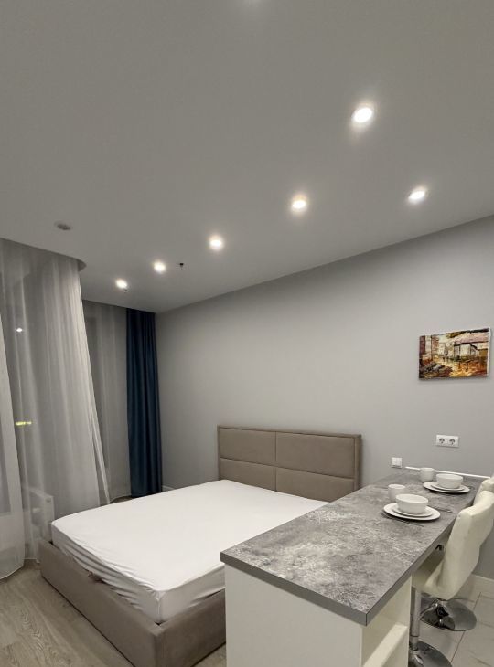 Студия оборудована всей необходимой для комфортного проживания мебелью и техникой, при желании можно доукомплектовать. Есть двуспальная кровать, посудомоечная машина, холодильник, варочная плита, вытяжка, стиральная машина, кондиционер, чайник, посуда, телевизор.