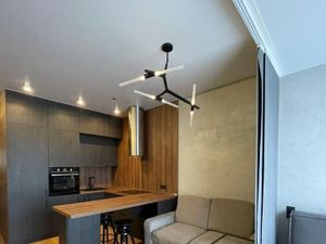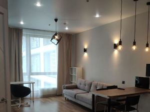 В квартире выполнен дизайнерский ремонт с использованием качественных материалов. Обстановка включает в себя всё необходимое для комфортного проживания: мебель в комнате и на кухне, а также современную технику — кондиционер, посудомоечную и стиральную машины, холодильник. В совмещённом санузле установлена душевая кабина. Из окна открывается вид на улицу, а в квартире есть лоджия.