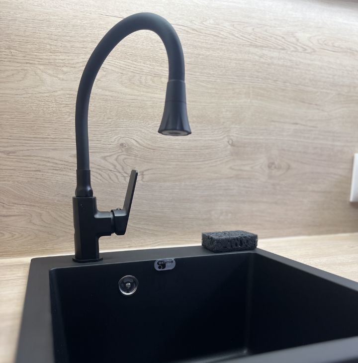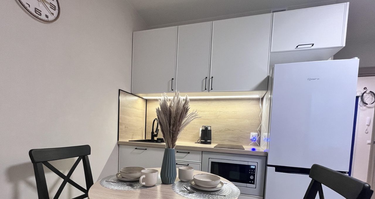 небольшая уютная кухня со всей необходимой техникой - варочной панелью, встроенной микроволновой печью с грилем (заменяет духовку), холодильником
