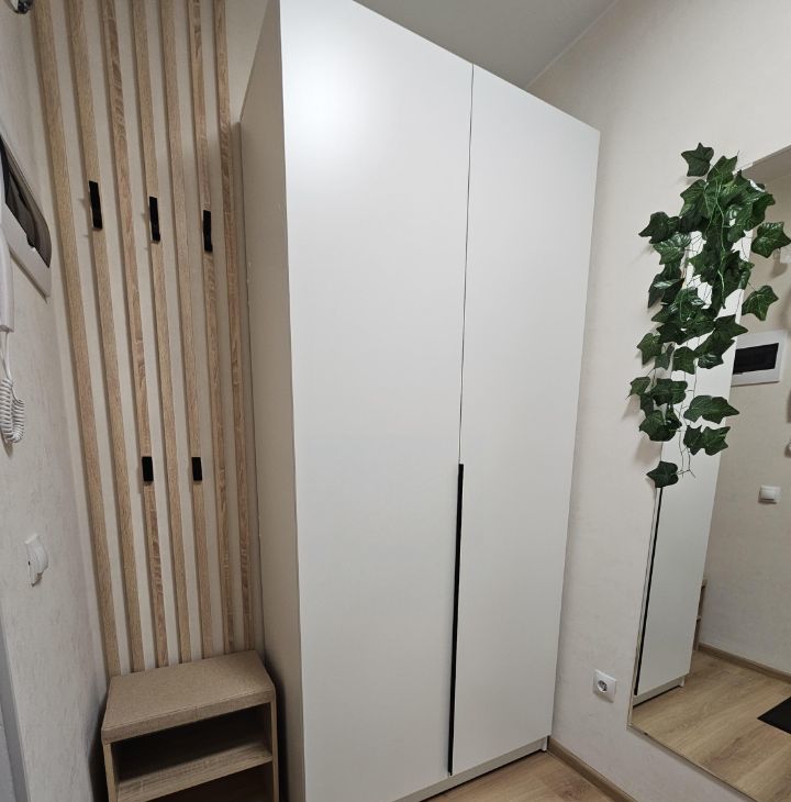 функциональная прихожая с вешалкой, шкафом и пуфом