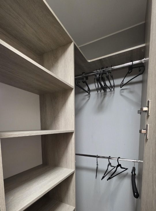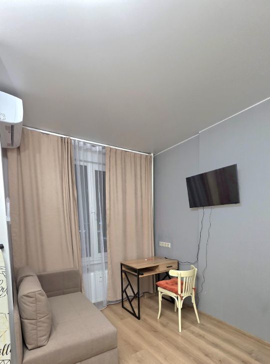 Есть все необходимое для комфорта, включая: кондиционер, чайник, гладильная доска, переносная и настенная сушилка для белья, кровать 140*200, небольшой диван, телевизор, компьютерный стол.