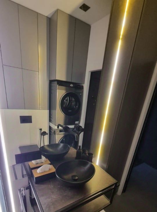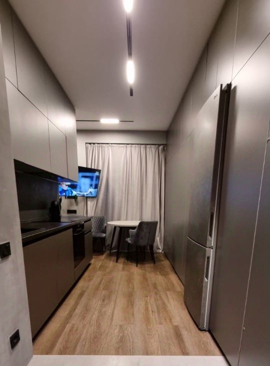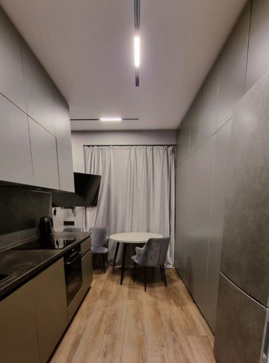В квартире установлено продуманное освещение, включая LED-ленты, трековые системы.