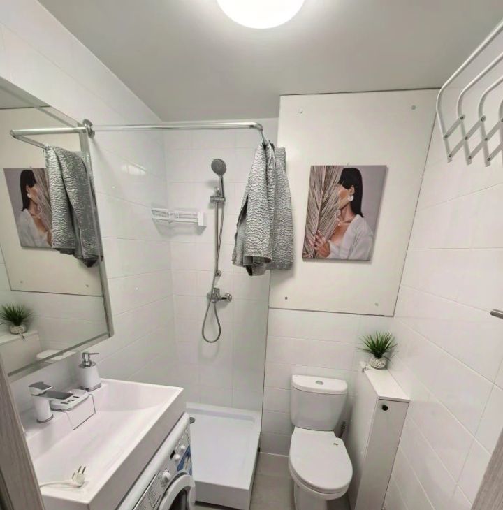 В ванной комнате также всё необходимое: раковина стиральная машина, сушилка для белья.