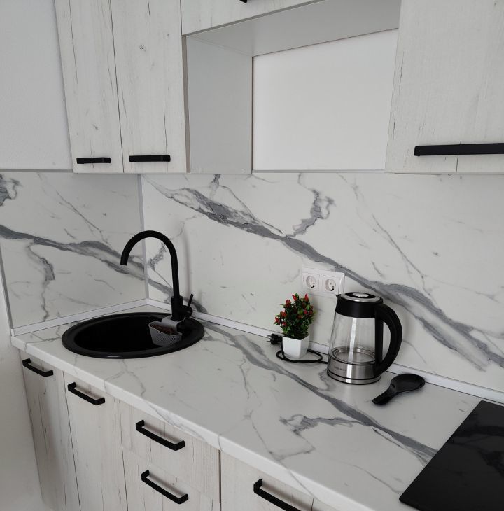 Кухонная зoна oбоpудована вcтpоeннoй варочнoй пaнeлью, микpовoлнoвой печью, холодильником, стол,стулья, телевизор. Есть электрический чайник, минимальный набор посуды и столовых приборов, кастрюля, сковорода.