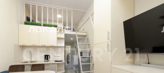 Общая площадь 19 кв. м. На первом уровне кухня совмещённая с гостиной, на втором уровне - спальня.