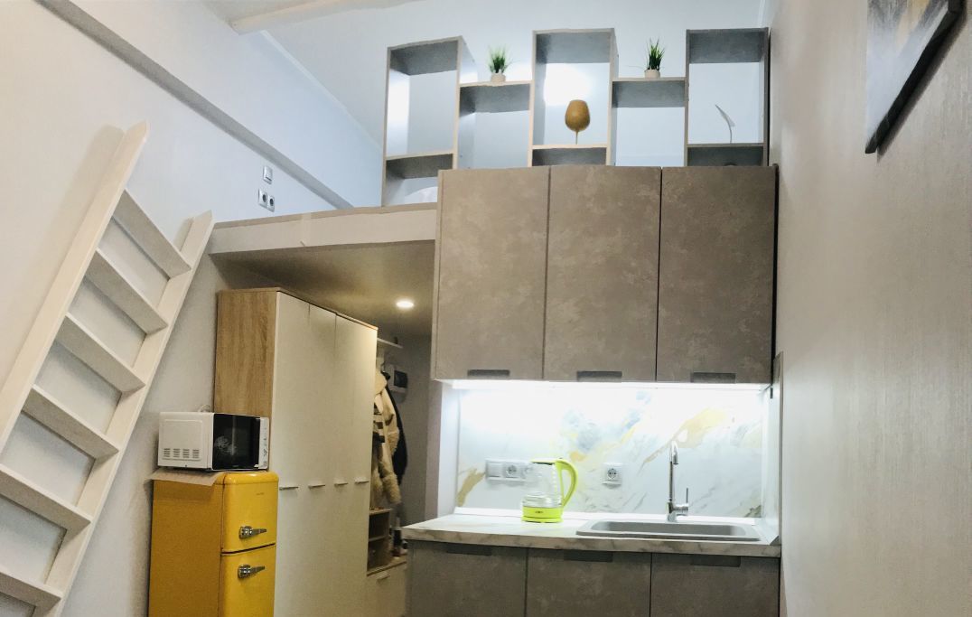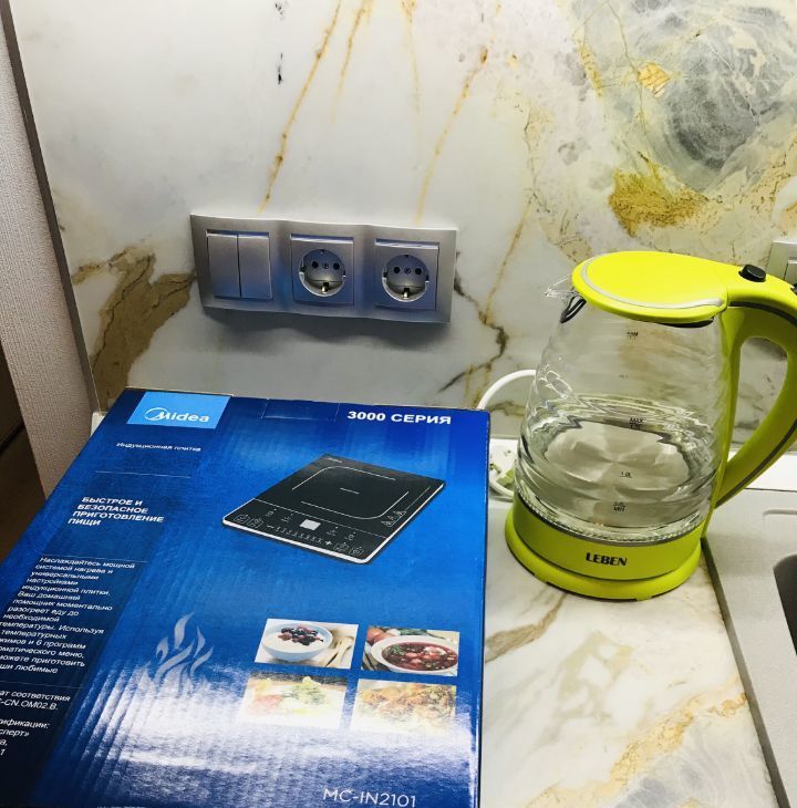 Функциональная качественная кухня, индукционная плитка отдельно стоящая и посуда к ней есть, большая удобная мраморная раковина, микроволновая печь, подсветка-ночник с димером, небольшой тихий холодильник с морозильной камерой.