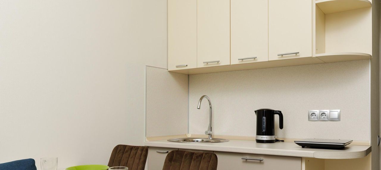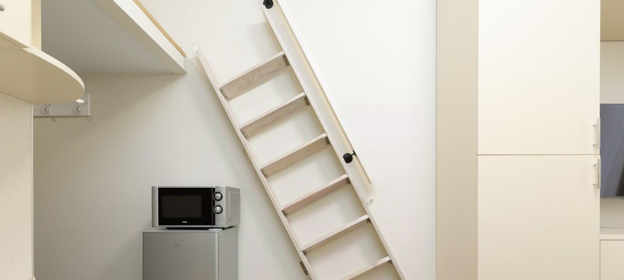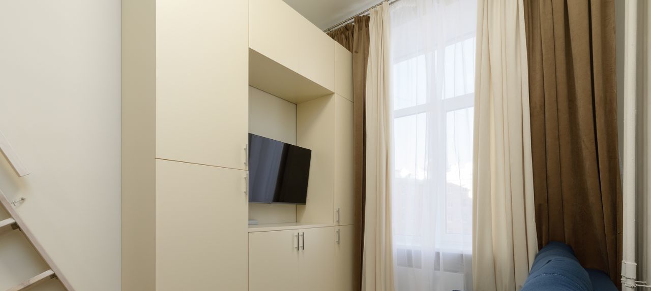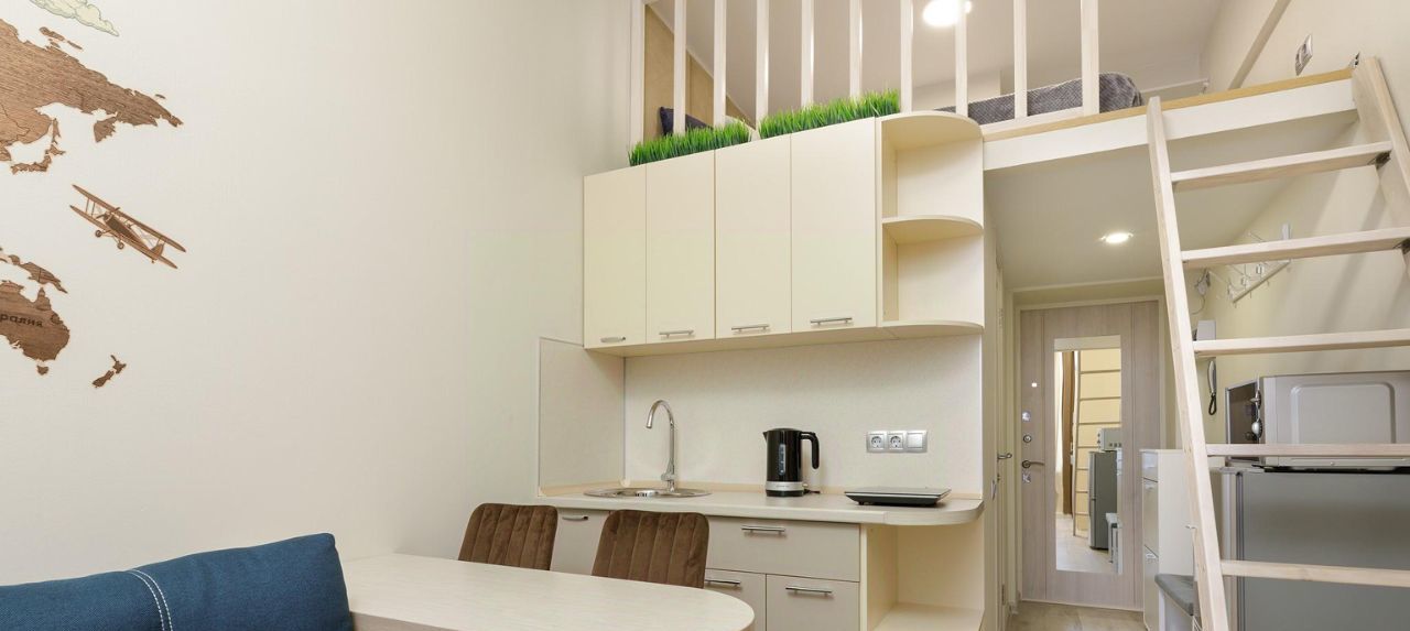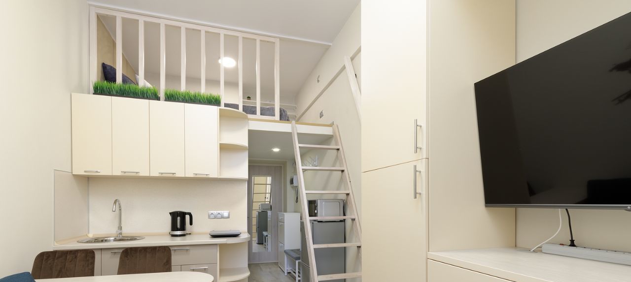Общая площадь 19 кв. м. На первом уровне кухня совмещённая с гостиной, на втором уровне - спальное Квартира готова для комфортного проживания, полностью меблирован и оснащен новой бытовой техникой: двуспальная кровать, диван, телевизор, холодильник, плита, микроволновка, электрочайник, набор посуды, стиральная машинка.