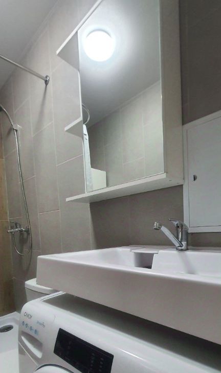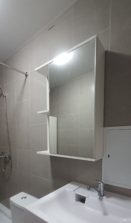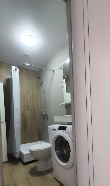 Санузел: совмещённый, просторный, современная душевая зона, установлена стиральная машина, шкаф для ванных принадлежностей, зеркало-шкаф