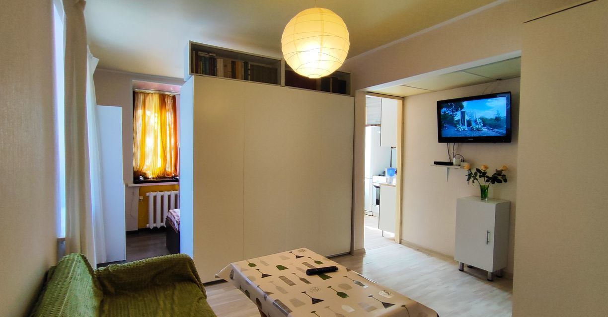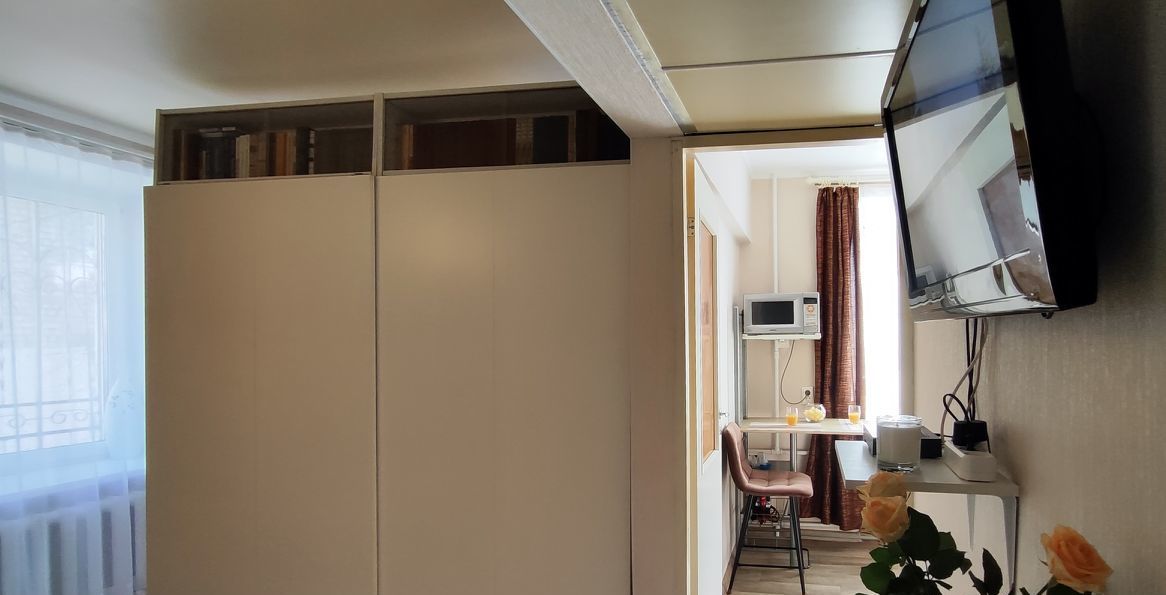 Светлая квартира студийной планировки (зонированная однокомнатная). Идеально подойдет для проживания родителя с ребенком или двух друзей/подруг.