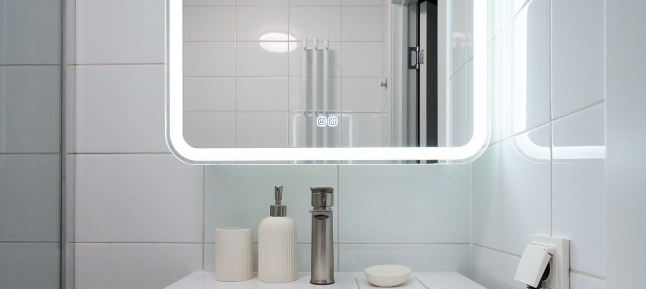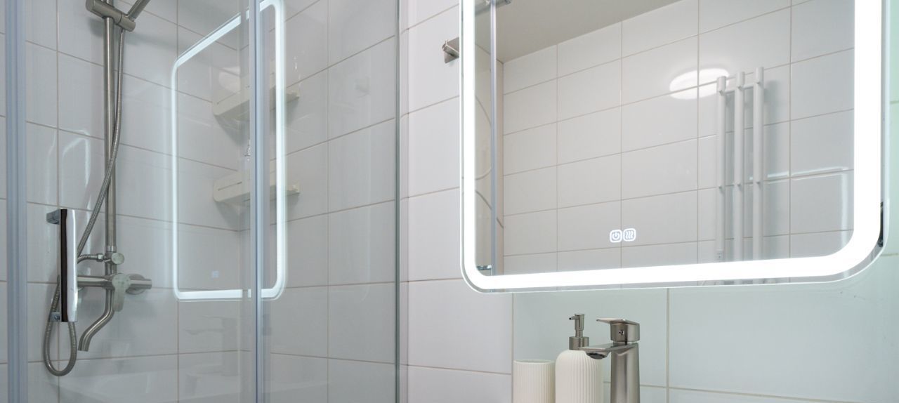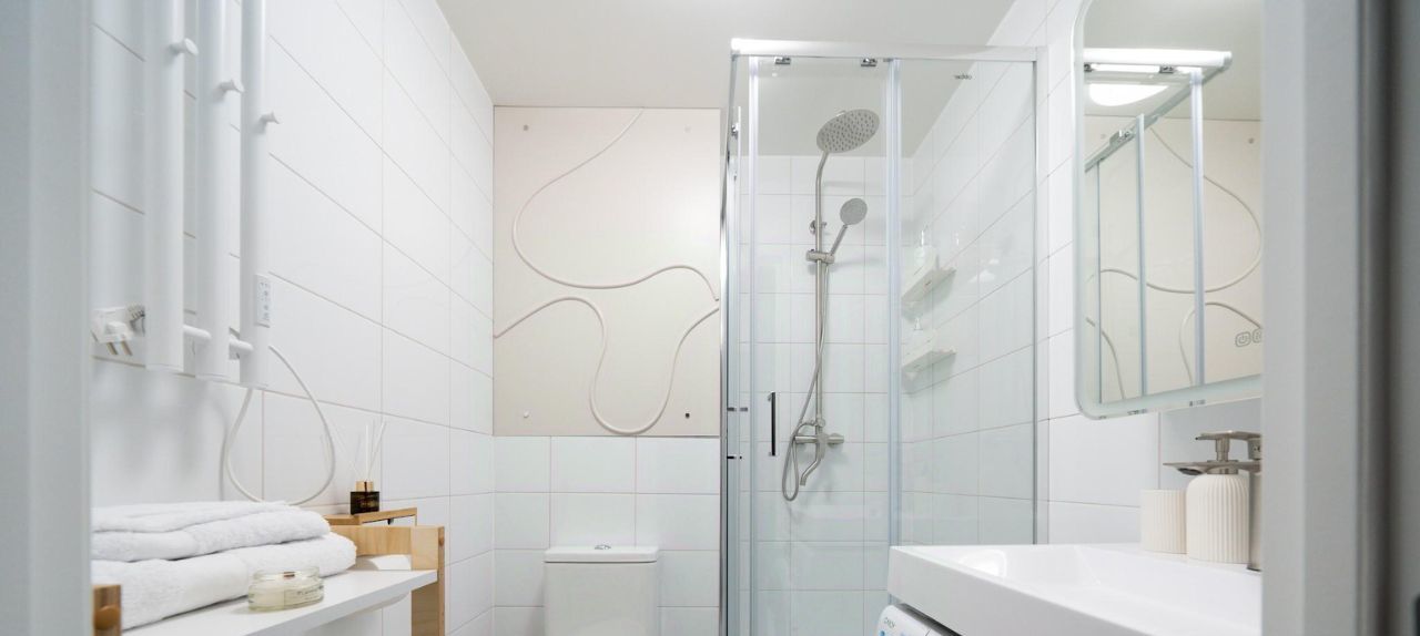 Санузел: душевые кабина, стиральная машина с функцией сушки 2-в-1— больше не нужно думать, где сушить белье. Дополнительно организованы места для хранения: зеркальный шкафчик и стеллаж.