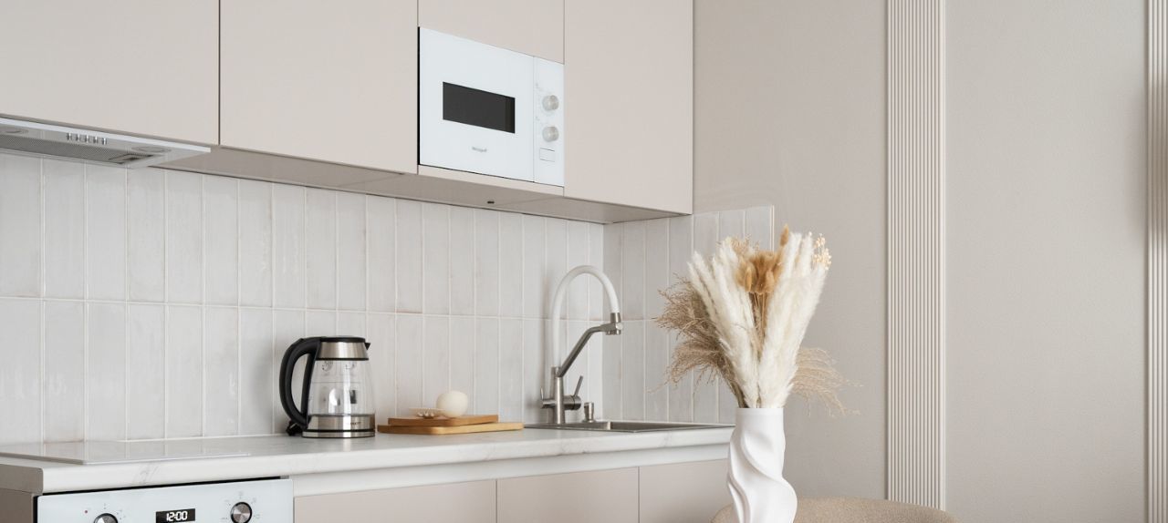 Кухня со всей необходимой техникой: встроенный холодильник, духовой шкаф, микроволновка, посудомоечная машина, индукционная панель, фильтр для воды.