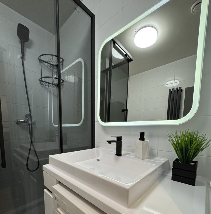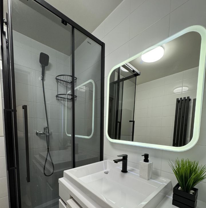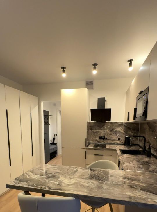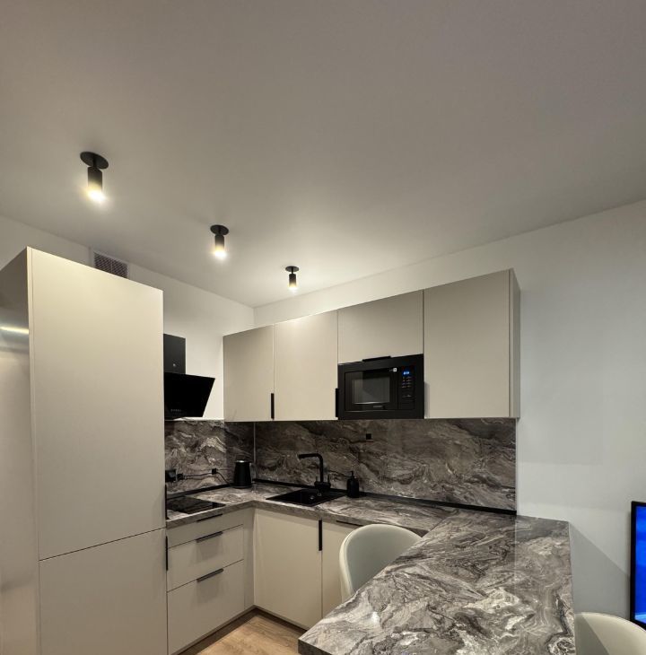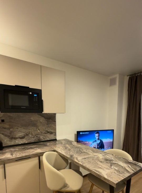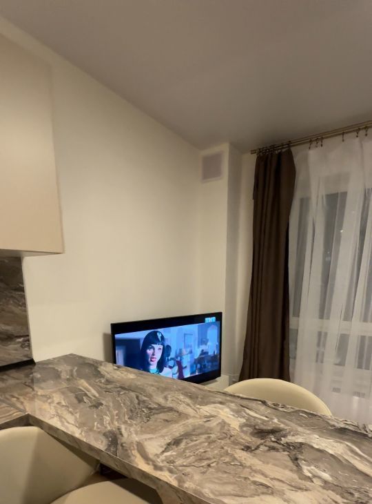 Есть посудомоечная машина, встроенная микроволновка, индукционная плита, холодильник no Frost, стиральная машина LG, телевизор 46 дюймов, диван с ортопедическим матрасом.