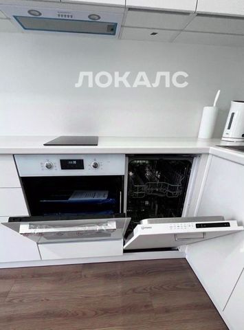 Кухня-гостиная: Встроенная кухня с техникой (холодильник, индукционная варочная панель, духовой шкаф, вытяжка, посудомоечная и стиральная машины, микроволновка).