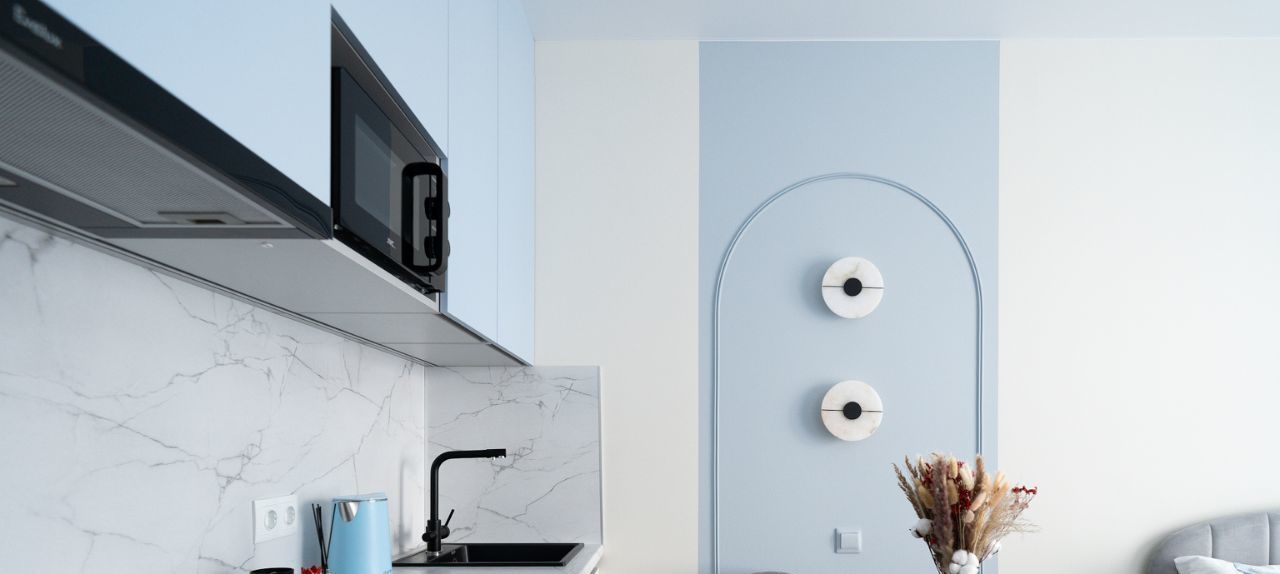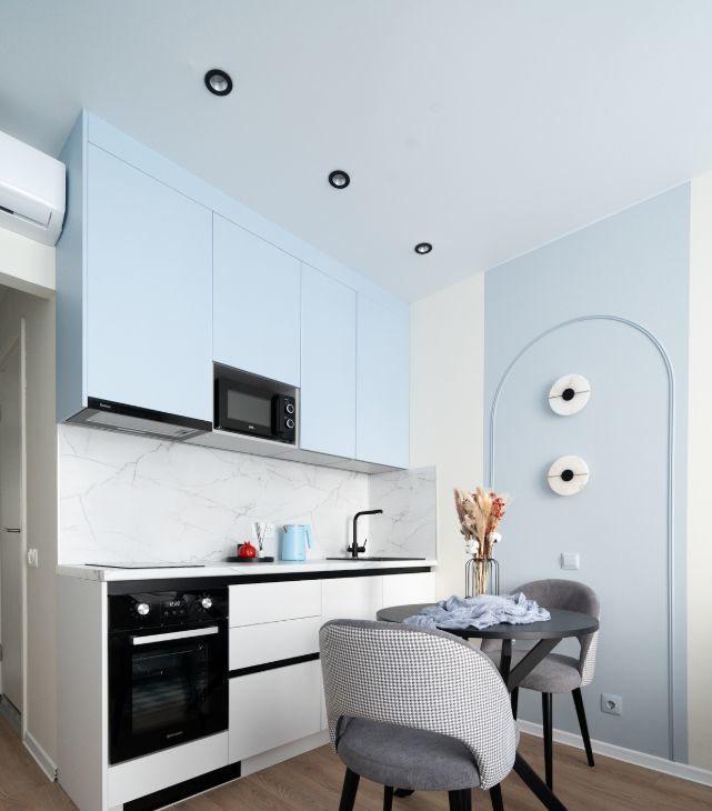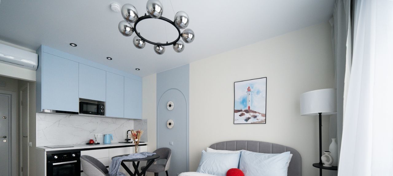 Вся комплектация: Двуспальная кровать с подъемным механизмом, удобным матрацем, а также воздушным одеялом для комфортного сна, подушками и постельным бельем. В студии большой шкаф, который вместит в себя не только вещи, но и необходимые в быту предметы, в шкафу предусмотрен отсек для гладильной доски и сушки для белья и т.п. Кроме шкафа в комнате установлен комод, а также вместительный шкаф в коридоре. Кухня с обеденной группой, оснащена всей необходимой техникой (встроенный холодильник, варочная панель и духовка, вытяжка, посудомоечная машина, микроволновая печь, чайник) и фильтром для воды. Рабочее место с удобным стулом расположено около окна. Стиральная машина с сушкой установлена в ванной комнате, где также имеется большое зеркало с подсветкой, шкафчик для хранения, электрический полотенцесушитель, корзина для белья.