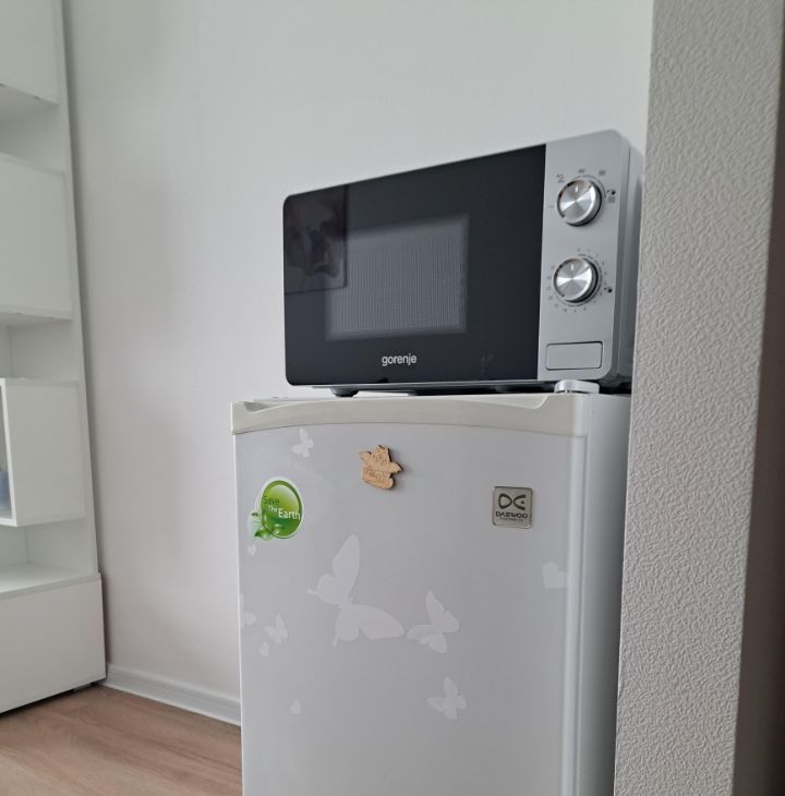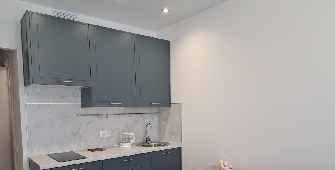 - Техника: индукционная плита, микроволновая печь, стиральная машина (в ванной), однокамерный холодильник, зеркало с подсветкой, электрический полотенцесушитель с возможностью установки температуры и времени нагрева, чайник.