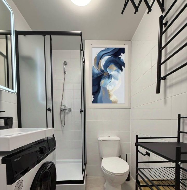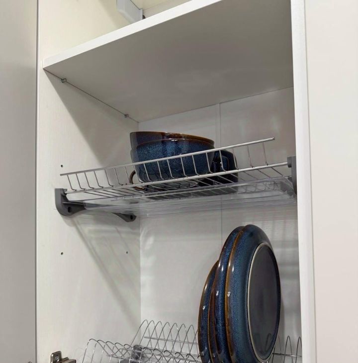 Большой холодильник, варочная панель, свч, вытяжка, стиральная машина, сушка для белья.