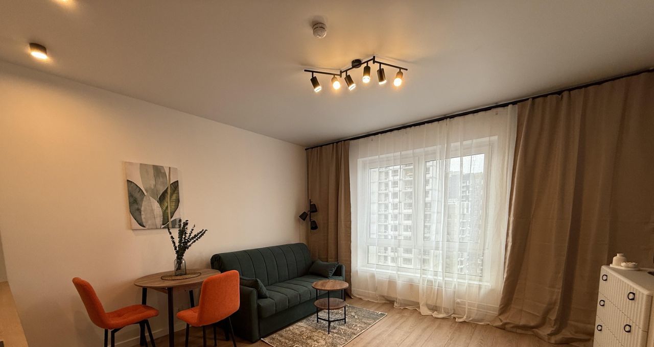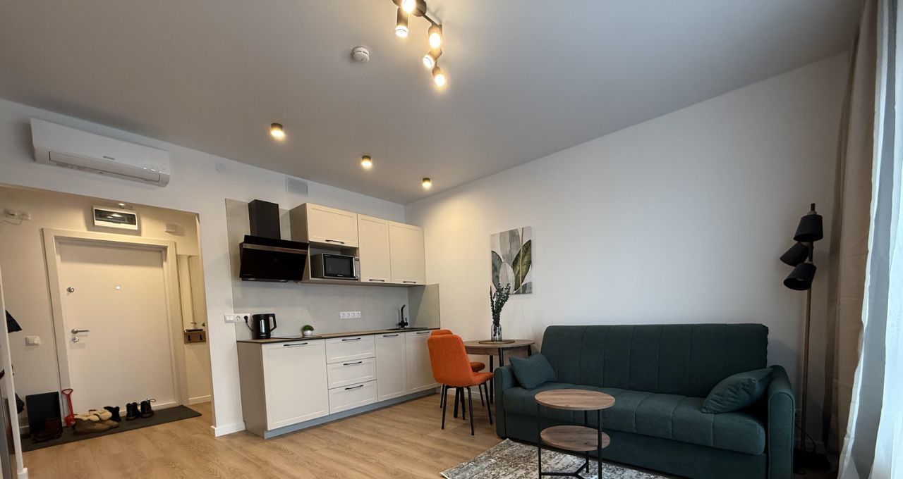 Пространство студии продумано до мелочей: кухня и комната обставлены современной мебелью, что делает проживание комфортным.