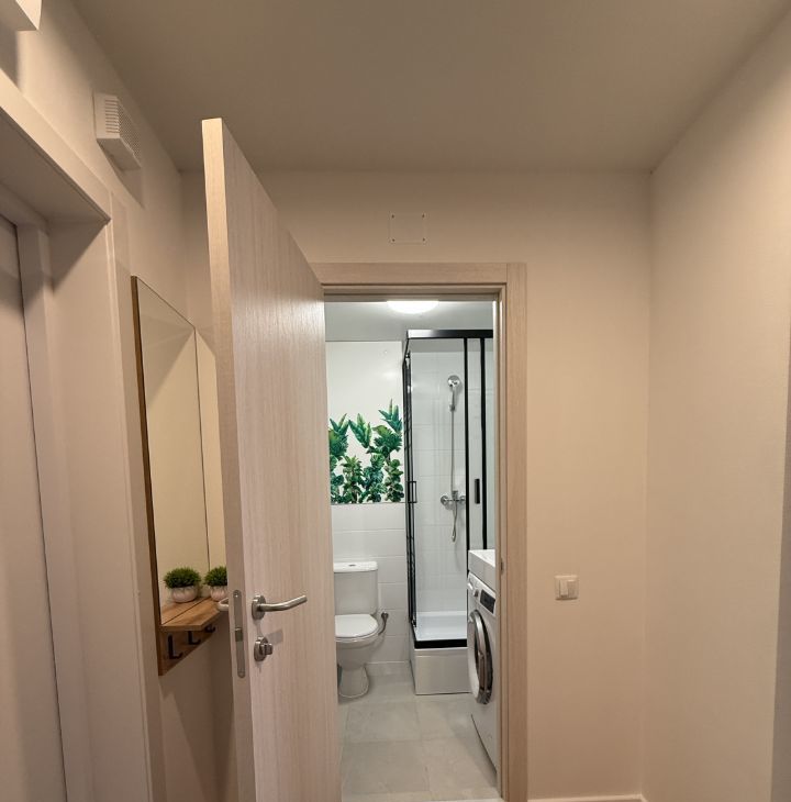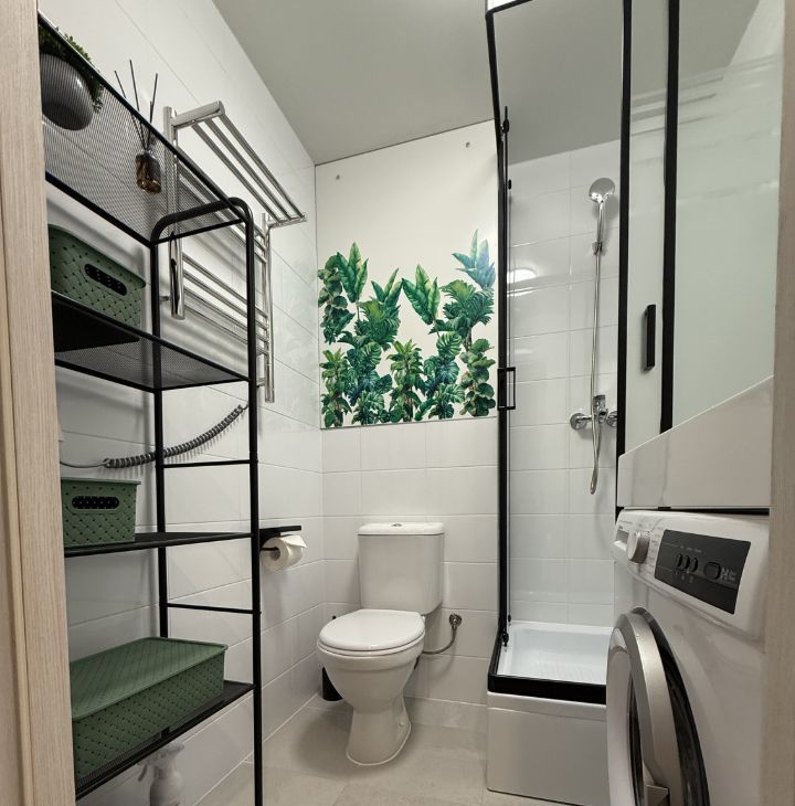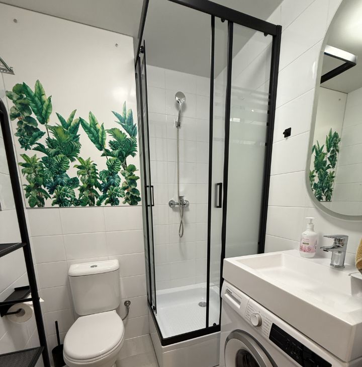 Новый диван с ортопедическим матрасом. Здесь есть всё необходимое для жизни: кондиционер, холодильник, телевизор и стиральная машина. В ванной комнате установлена душевая кабина.