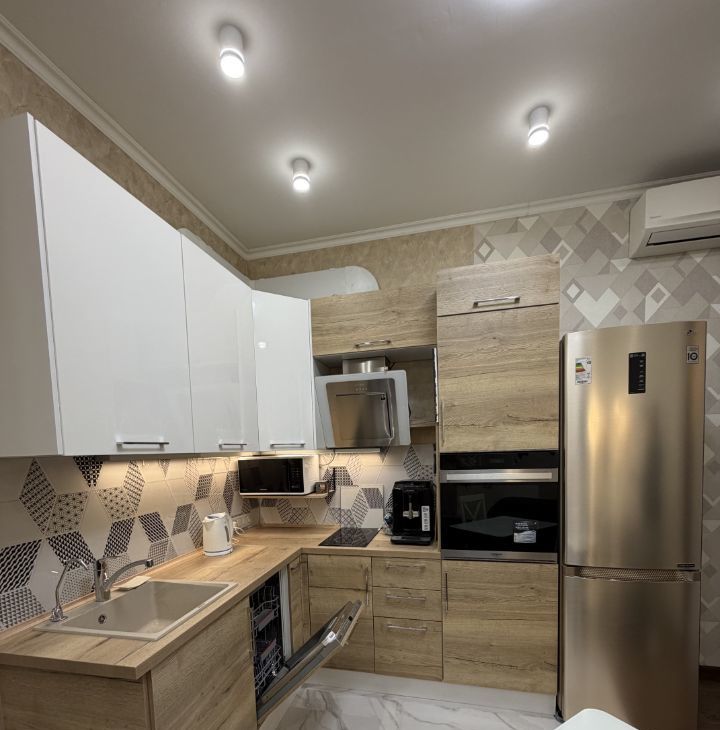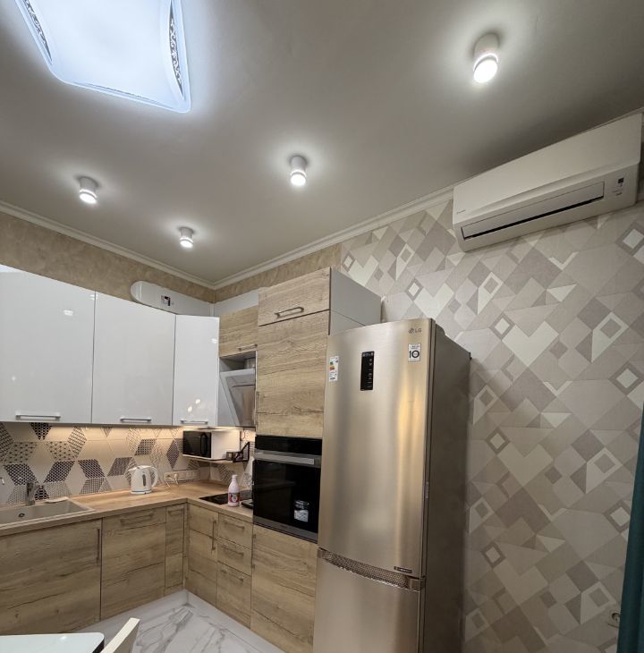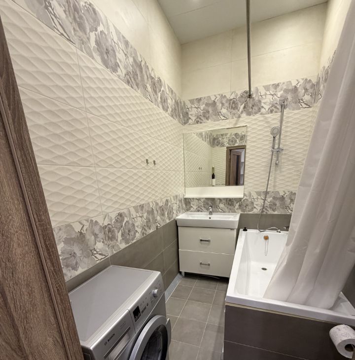 В квартире сделан качественный ремонт, который идеально сочетает комфорт и уют. Кухня и жилая зона полностью меблированы, поэтому можно сразу въехать и начать жить. В наличии вся необходимая техника: кондиционер, холодильник, посудомоечная и стиральная машины, телевизор, а также в местах где уложена плитка находится теплый пол. Совмещённый санузел оборудован ванной.