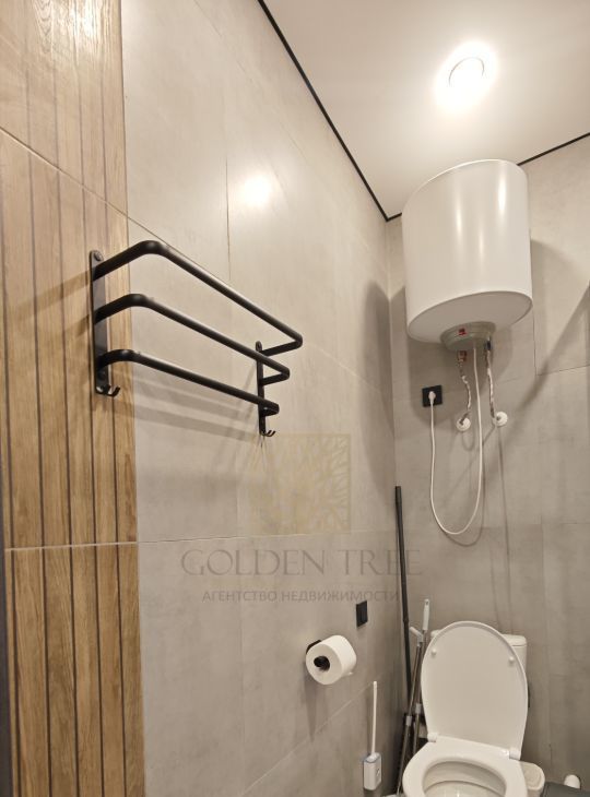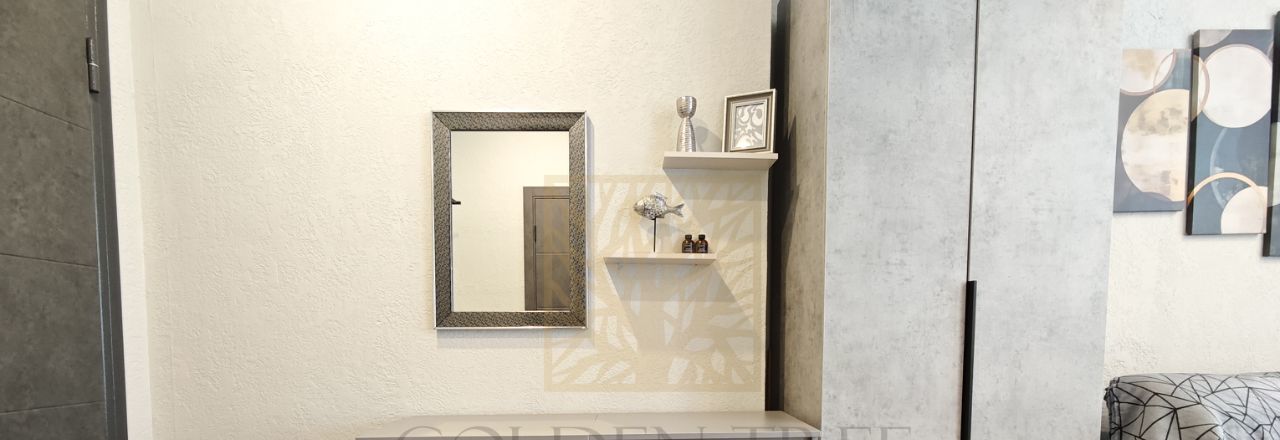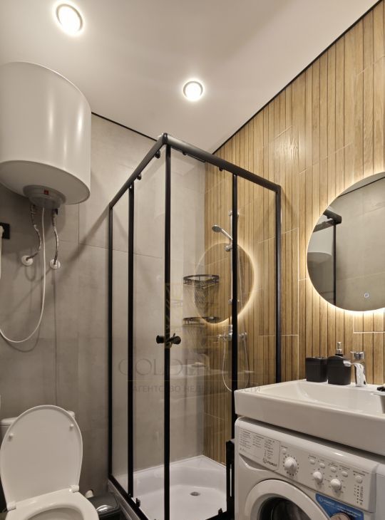 В студии установлен бойлер - всегда есть горячая вода, стиральная машина и зеркало с подсветкой, много полочек чтобы разместить средства для ухода и бытовую химию.