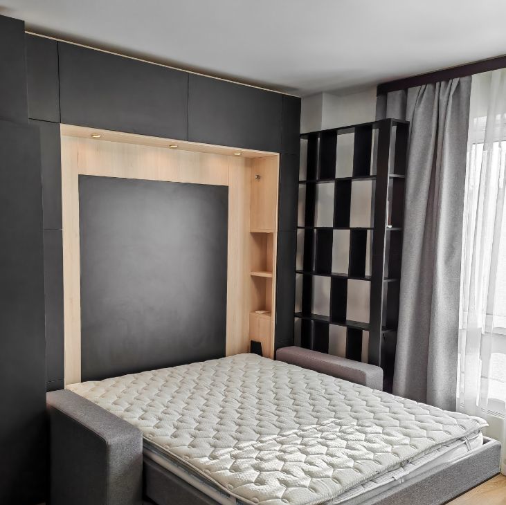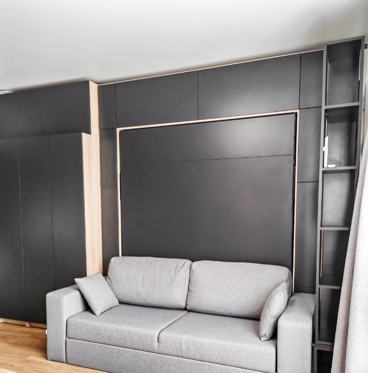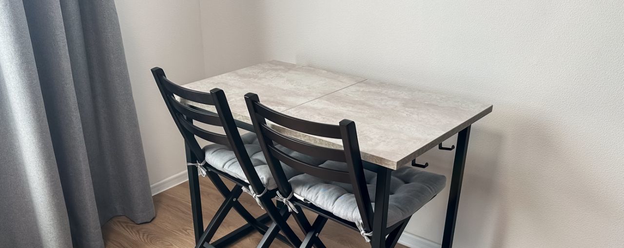 В студии установлен шкаф-кровать с диваном, на кровати отличный новый матрас Аскона средней жесткости, также есть наматрасник, делающий его более мягким. Есть зона для проектора. На фото показаны два складных стула из трёх, которые могут храниться в коридорном шкафу. Стол (шириной 100 см) раскладывается до 120 см.